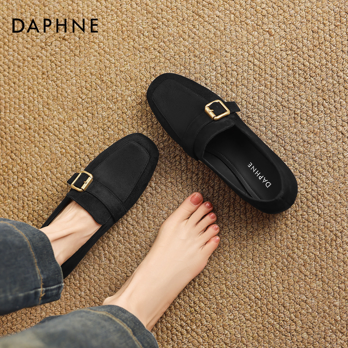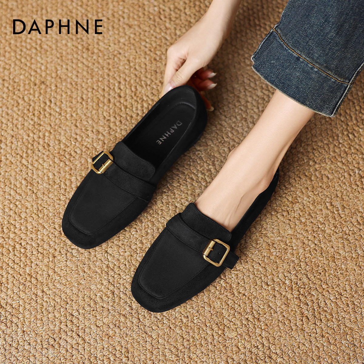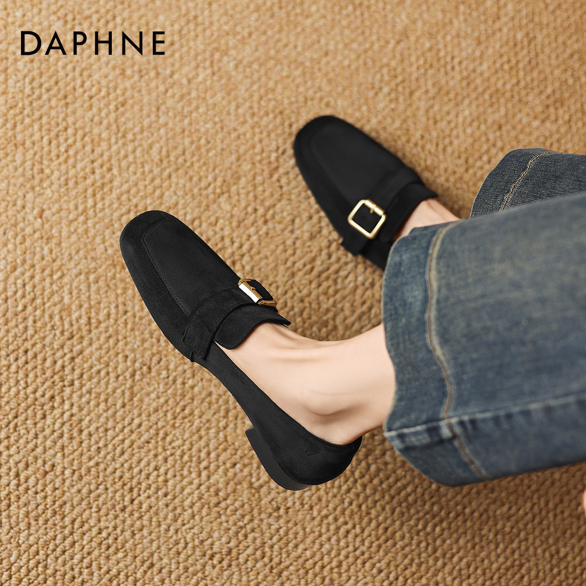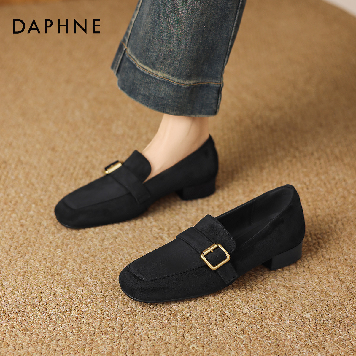 达芙妮乐福鞋女2026年新款春季绒面黑色小皮鞋女款粗跟单鞋豆豆鞋