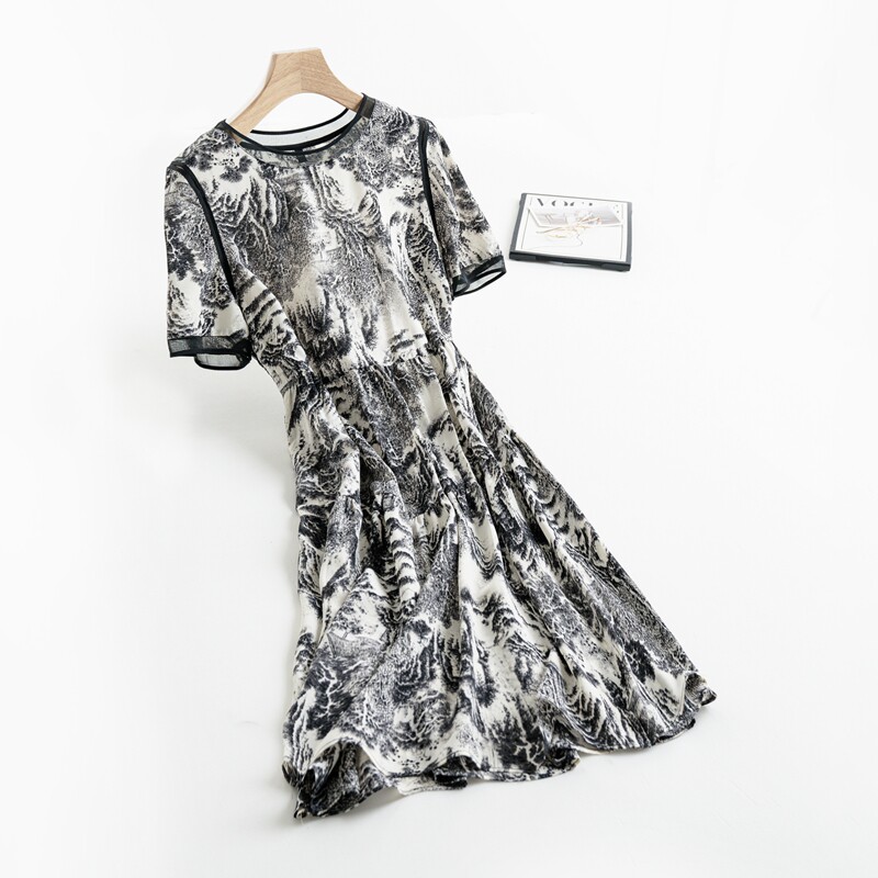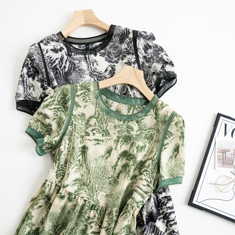 妈妈装夏新款短袖印花中老年减龄雪纺连衣裙
