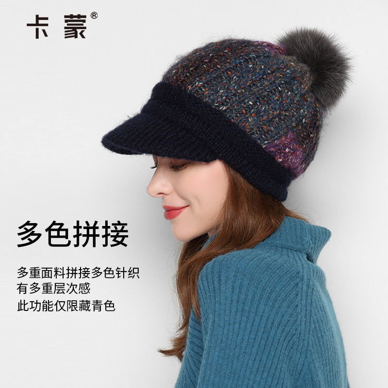 卡蒙发热抗菌毛线帽贝雷帽子女冬天韩版针织帽百搭后托帽狐狸毛球
