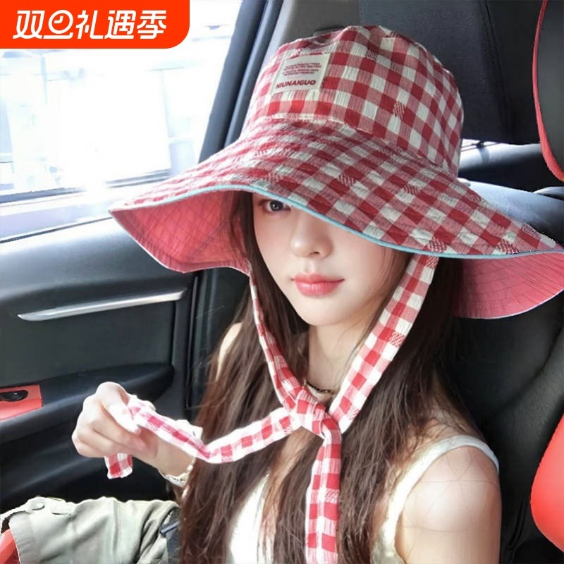 夏季绑带渔夫帽女大檐显脸小防晒遮阳帽子大头双面盆帽帽檐出游