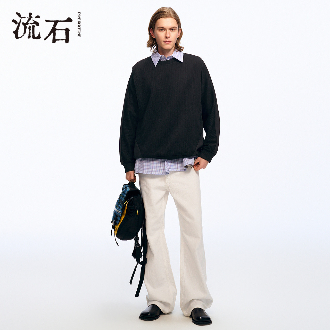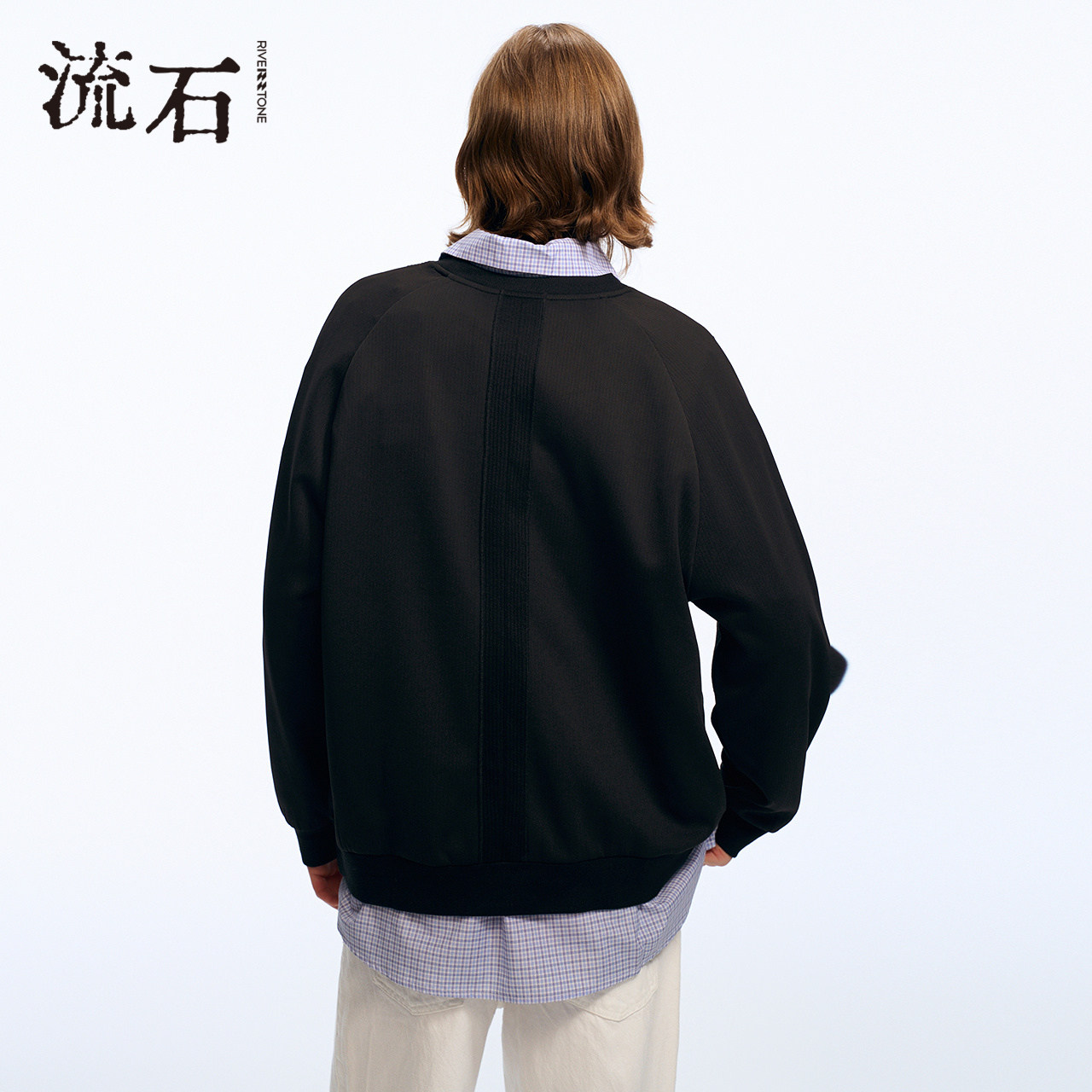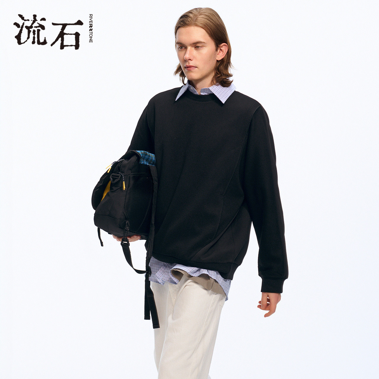 流石男装时尚高端纯色条纹卫衣2026年秋季新款男士设计感拼接上衣