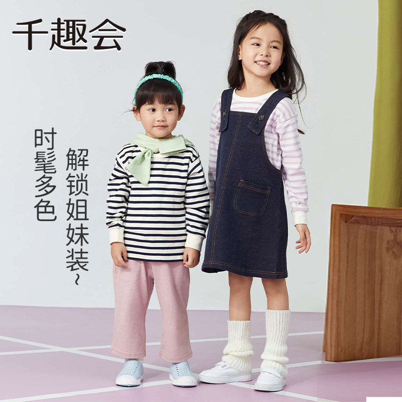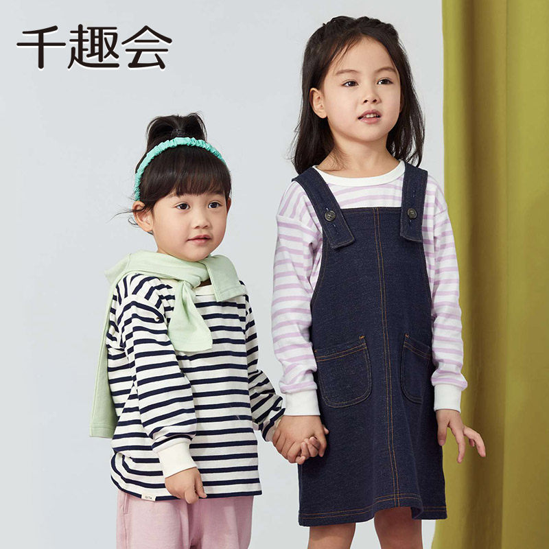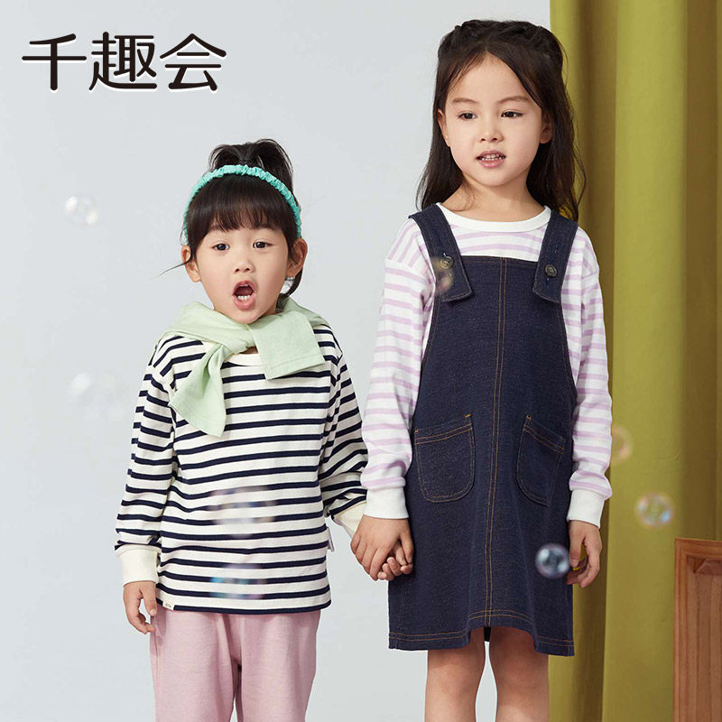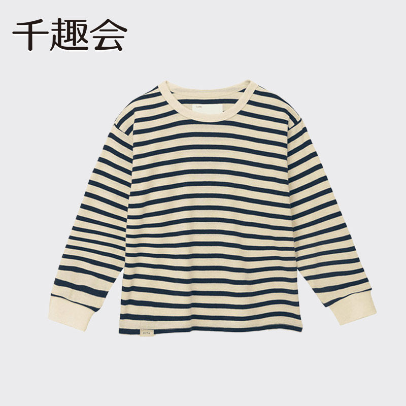 千趣会童装儿童25春秋长袖棉T恤男女童亲子款百搭条纹上衣打底衫