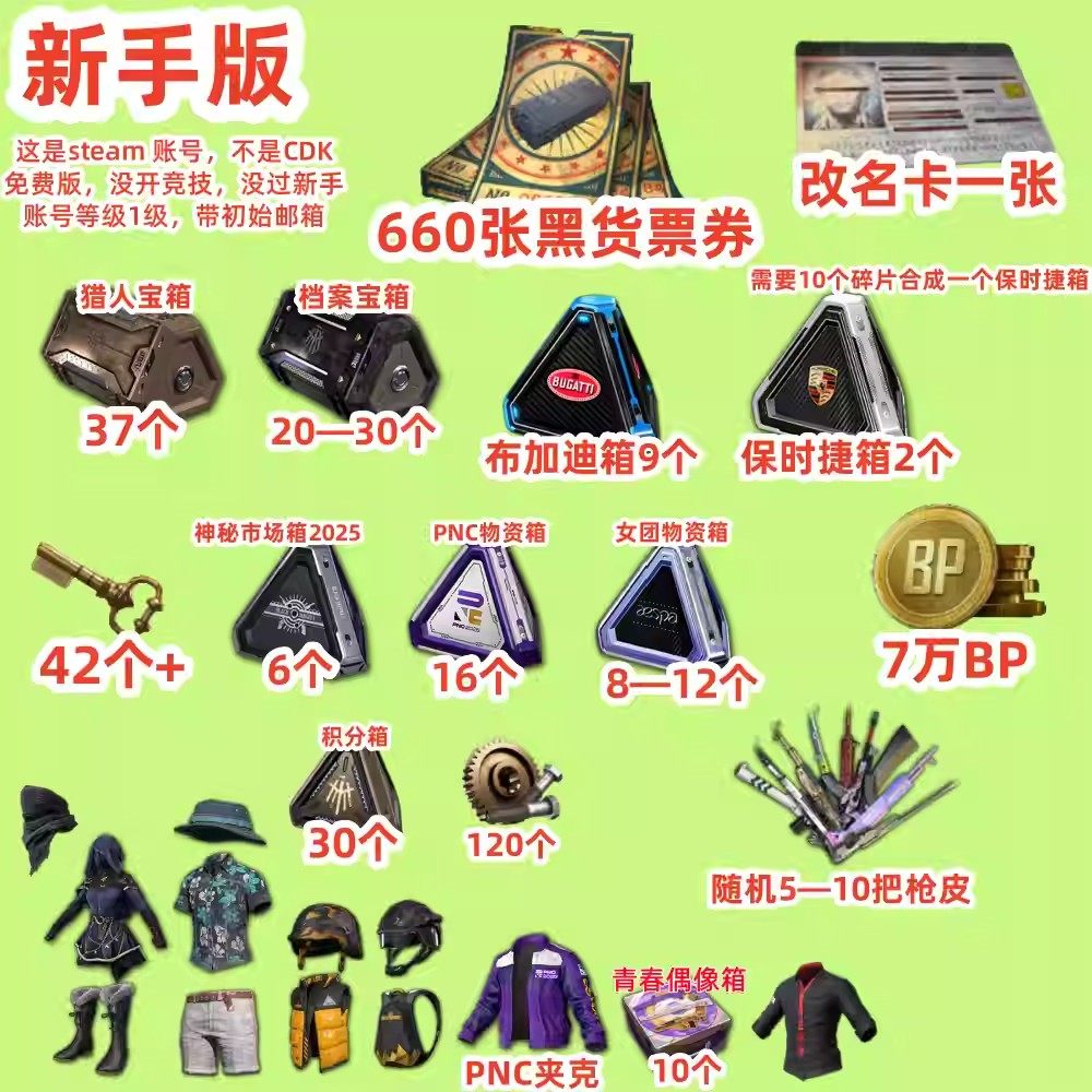 绝地求生账号PUBG吃鸡皮肤黑货票券号开成长武器保时捷跑车开箱号