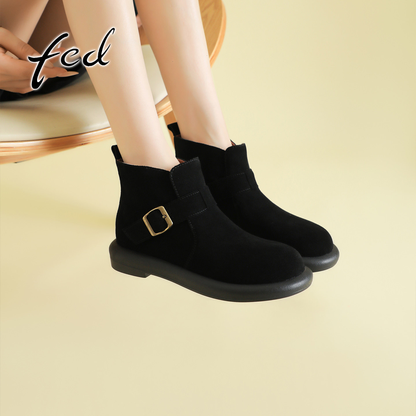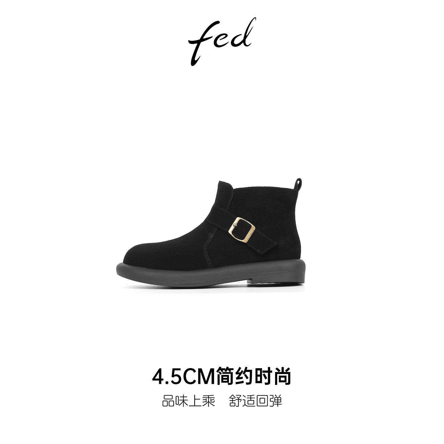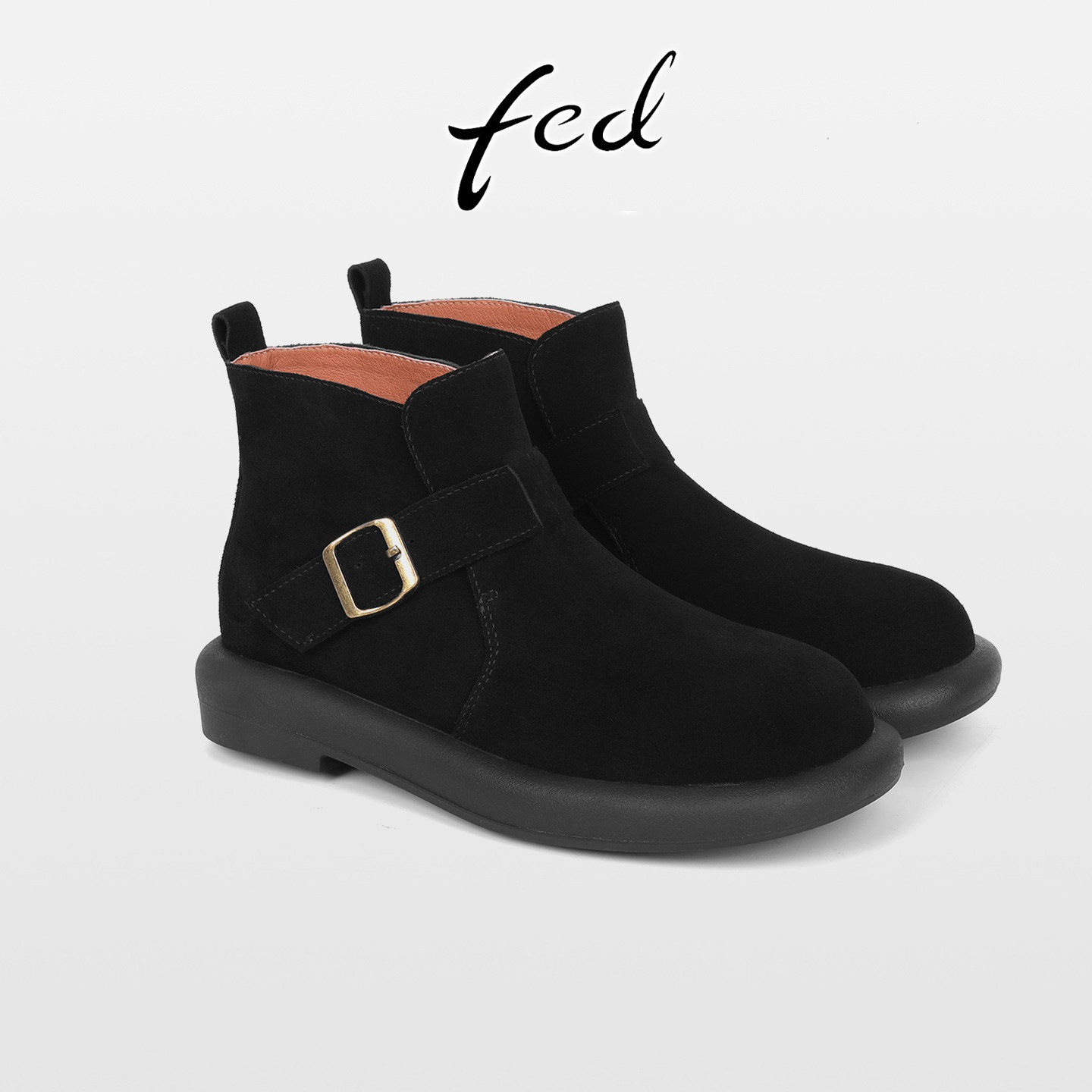 fed复古磨砂牛皮厚底皮带扣马丁靴女及踝靴秋冬新款中跟圆头短靴