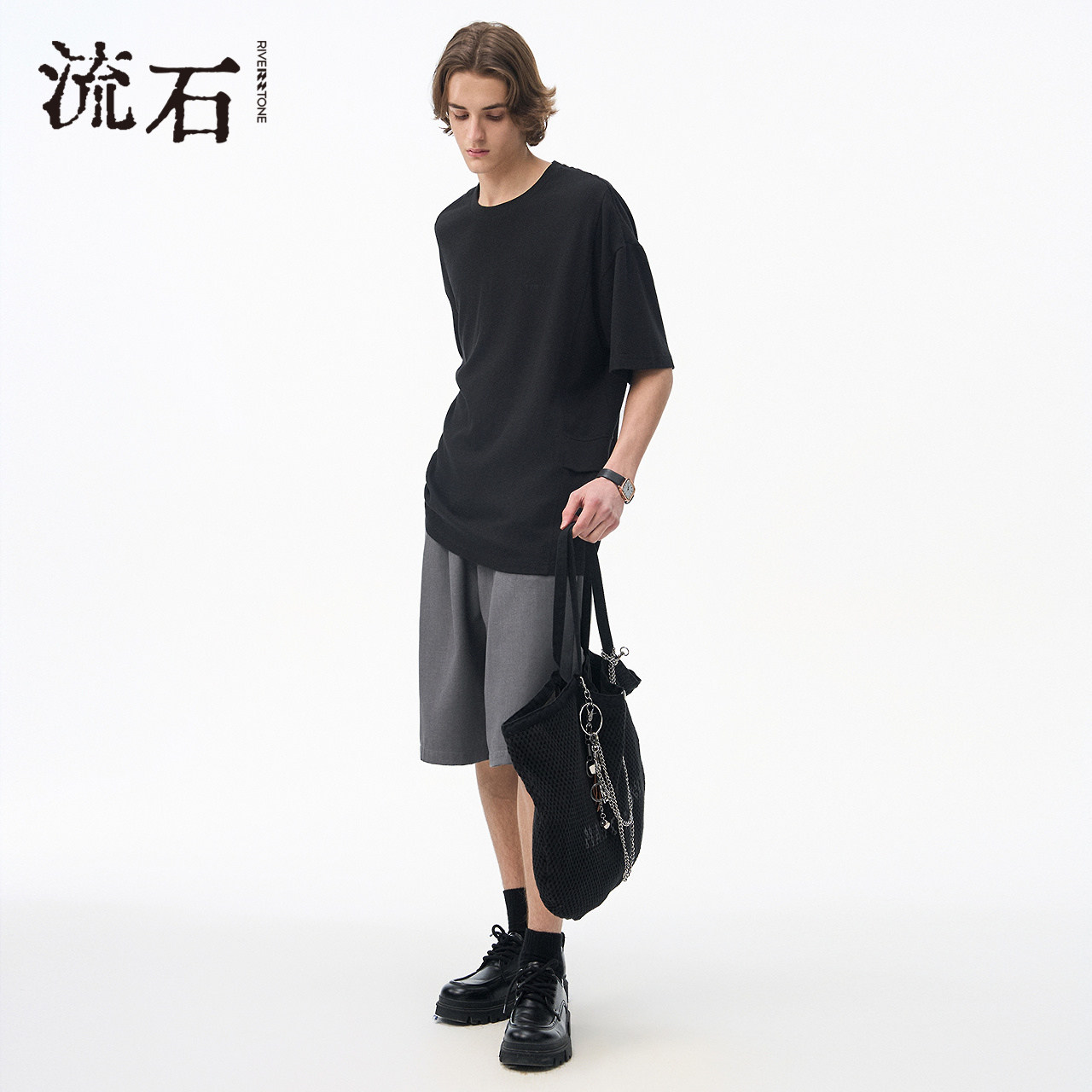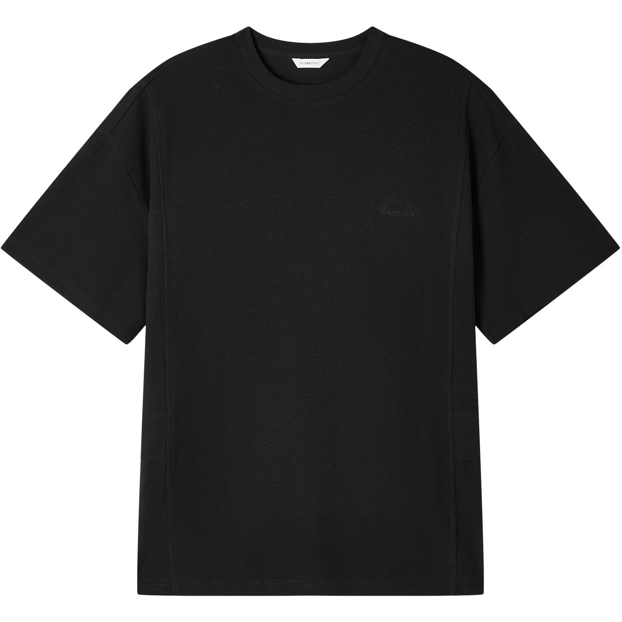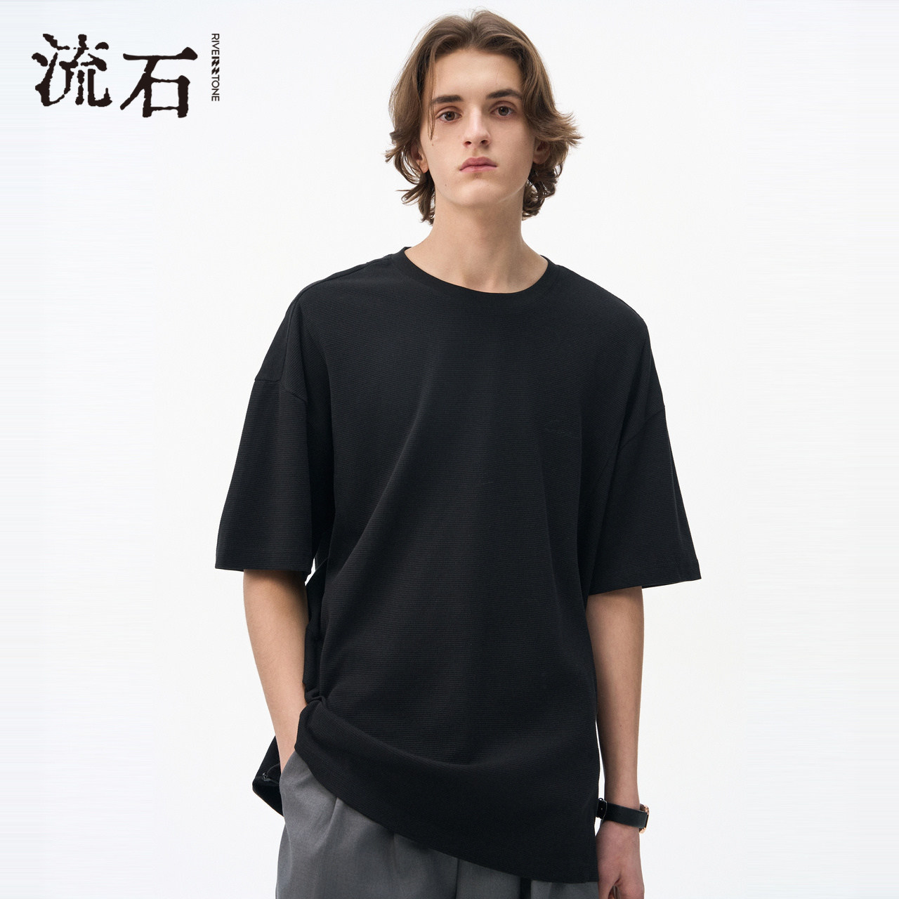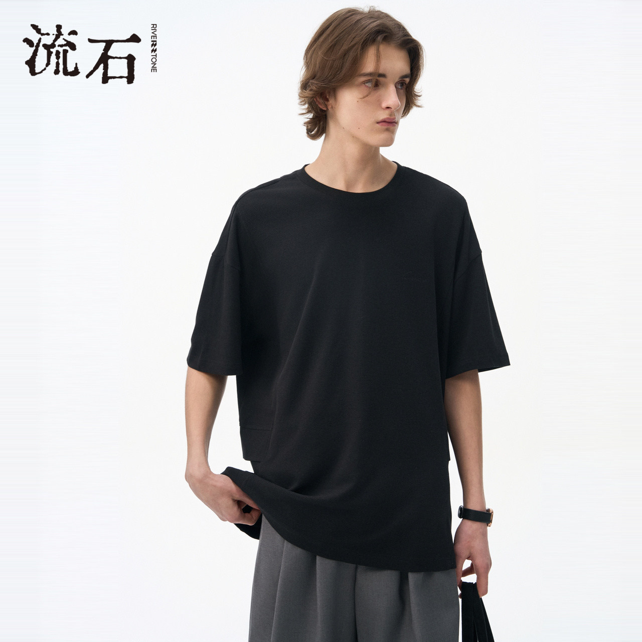 流石男装斜纹拼接短袖T恤衫2026年夏季新款男士黑色刺绣贴袋上衣