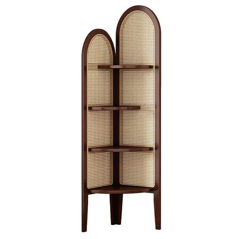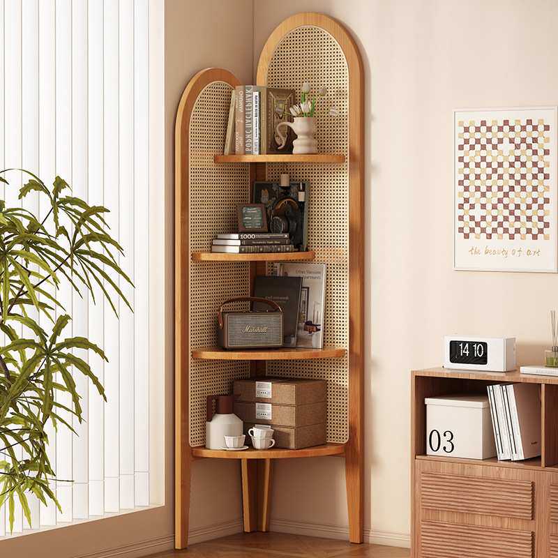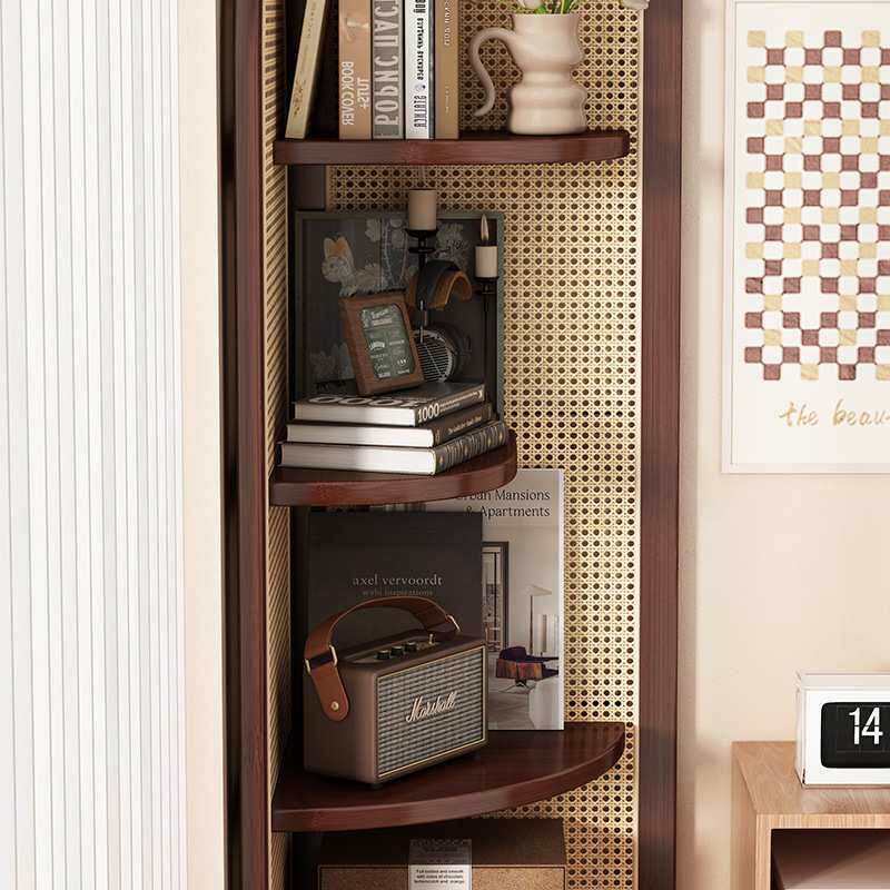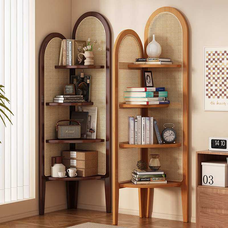 中复古式藤编转角屏风装饰客厅沙发墙边书柜子卧室实木三拐置物架