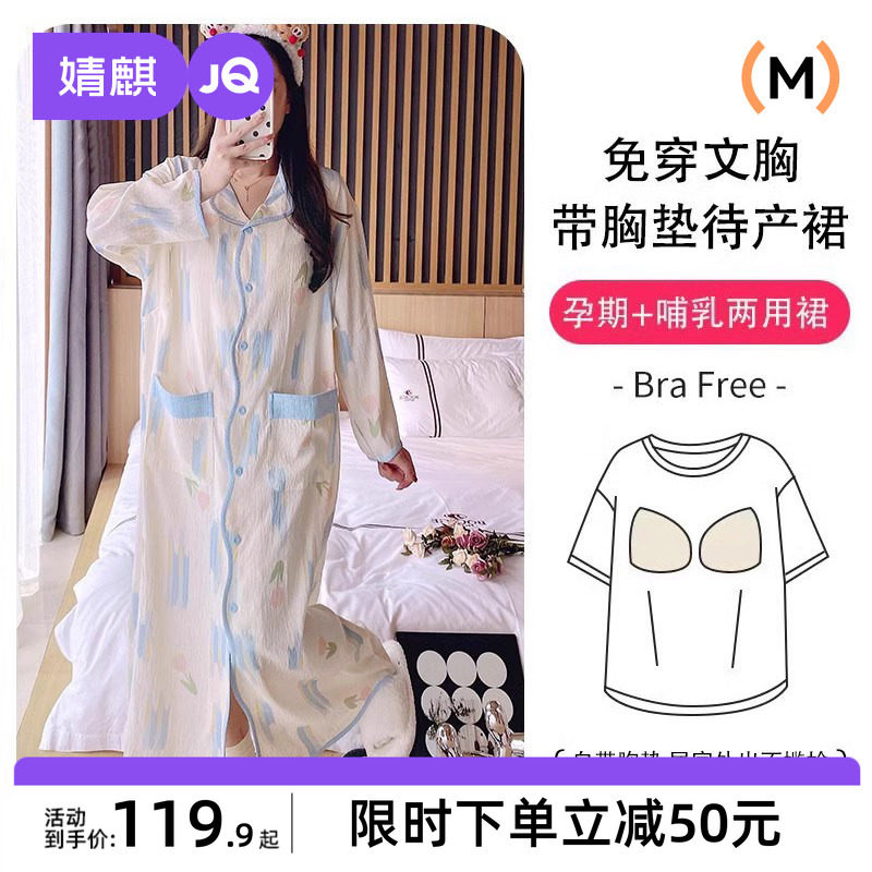 春秋纯棉带胸垫月子服医院待产裙产妇孕妇睡裙喂奶哺乳衣产前产后