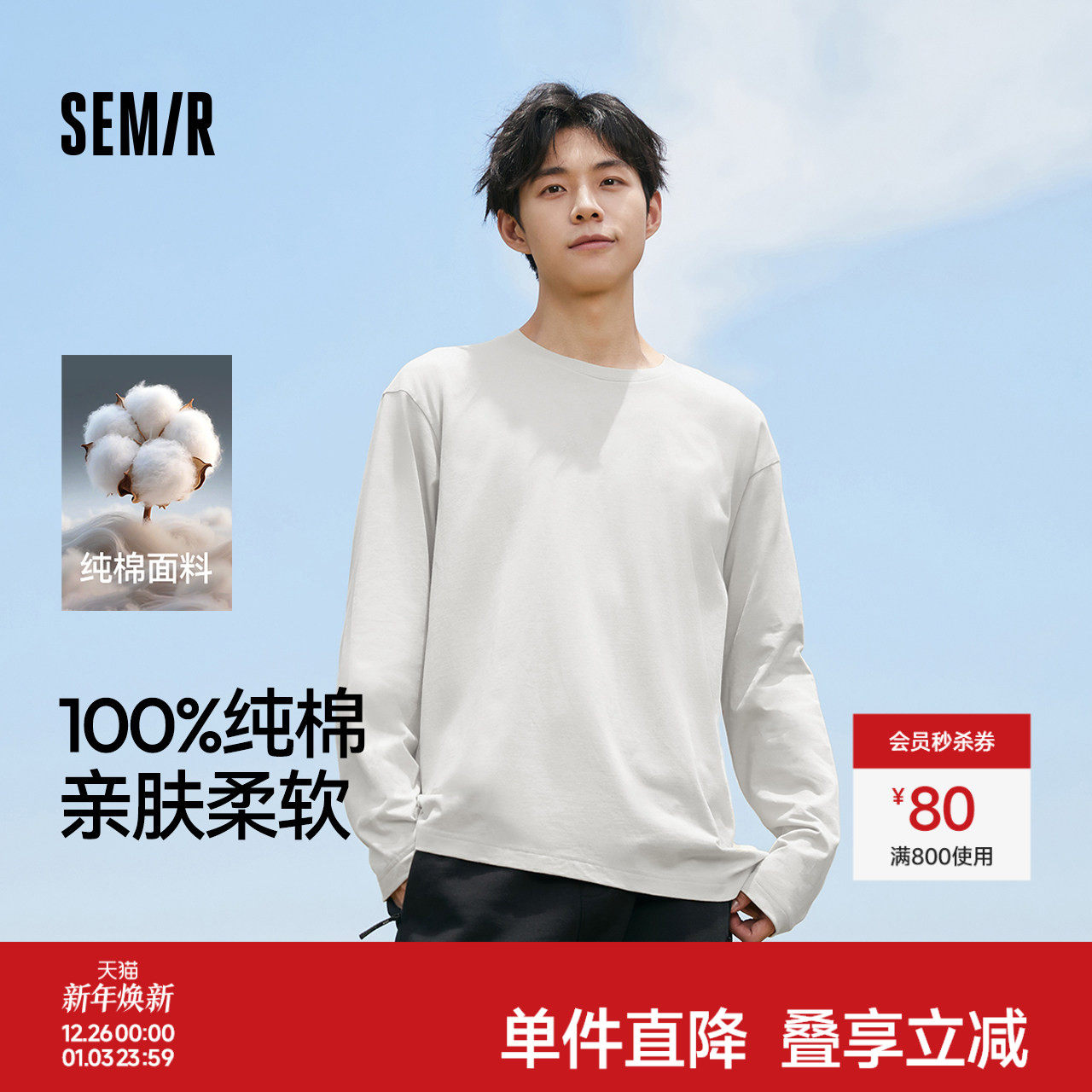 森马长袖T恤男纯棉白色内搭2025春秋新款打底上衣基础百搭情侣款