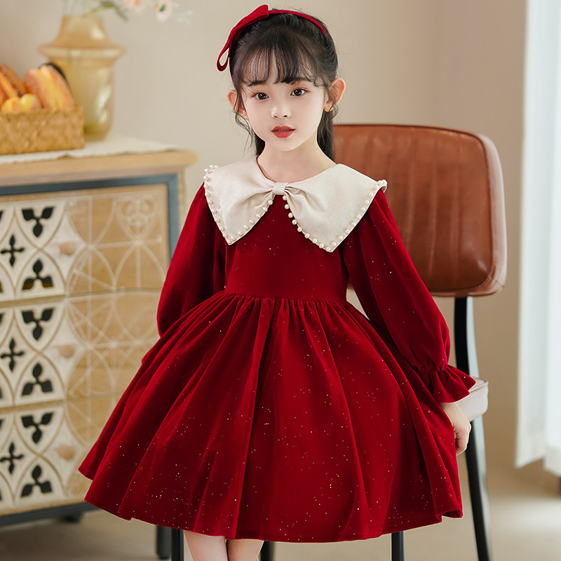 女童公主裙秋冬装儿童红色丝绒连衣裙小女孩新年衣服绝美礼服裙子
