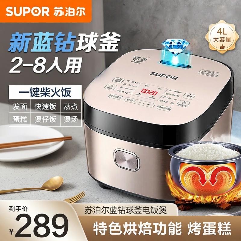 苏泊尔电饭煲多功能蓝钻球釜电饭锅4L家用3-7人煮饭锅大容量内胆