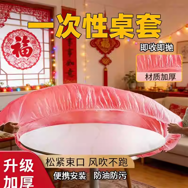 桌布一次性餐罩加厚束口松紧带圆桌子红色塑料布薄膜结婚防油方桌