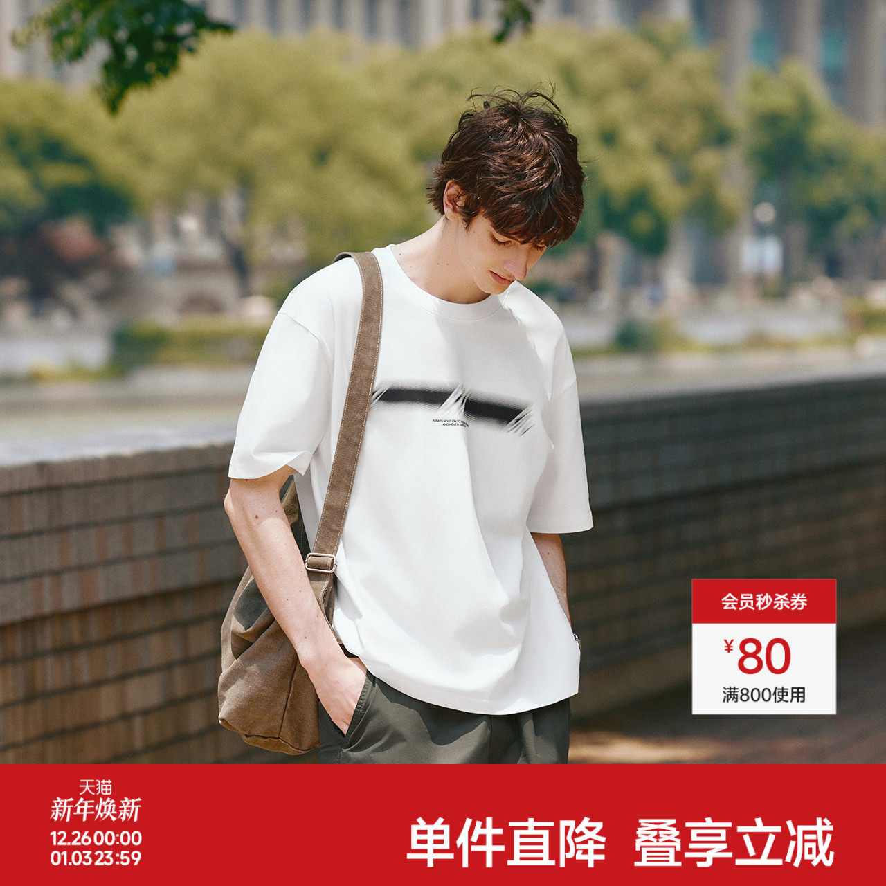森马短袖T恤男撞色印花圆领针织上衣秋季宽松落肩休闲装简约百搭