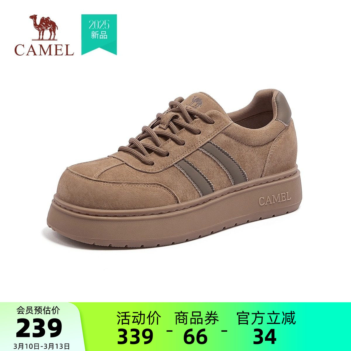 骆驼女鞋2026春季新款休闲板鞋面包鞋厚底显高百搭复古运动德训鞋