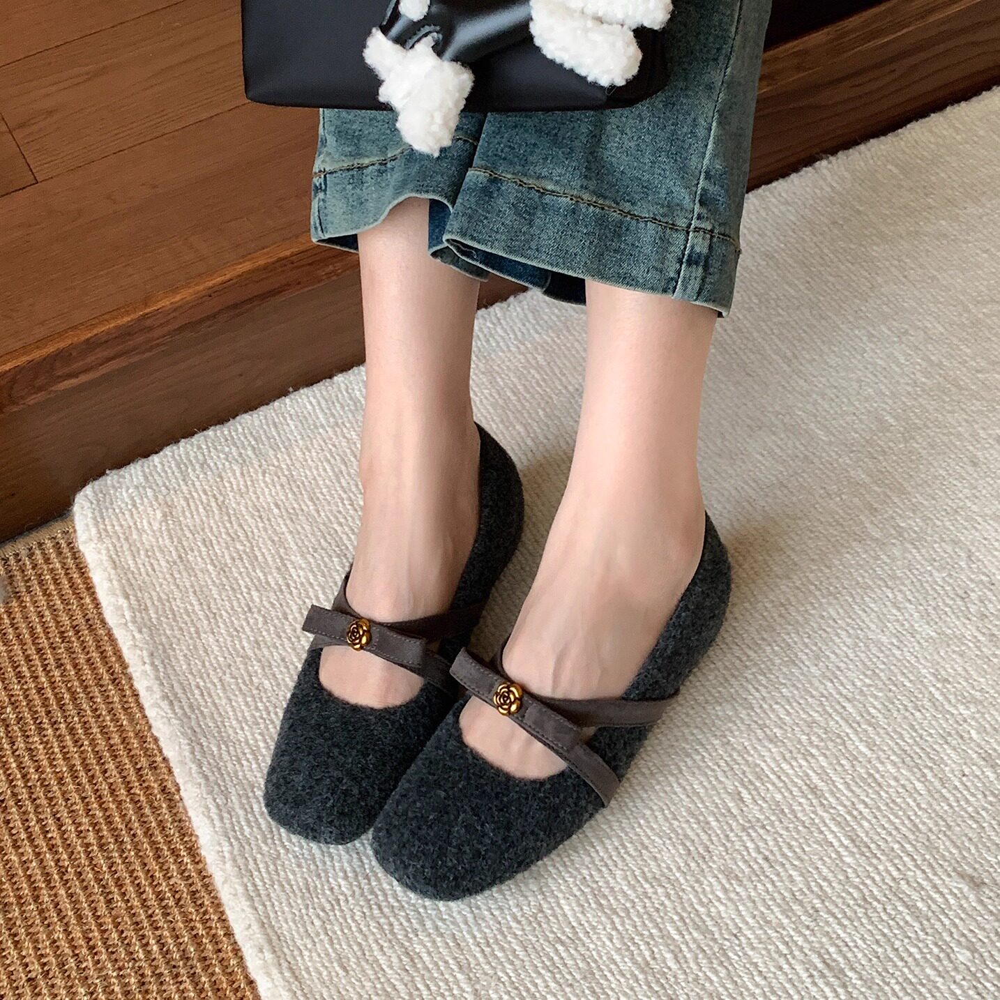 羊皮版复古玛丽珍鞋女方头秋冬季加绒保暖毛毛棉鞋平底晚晚单鞋女