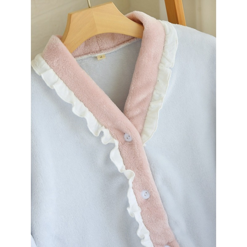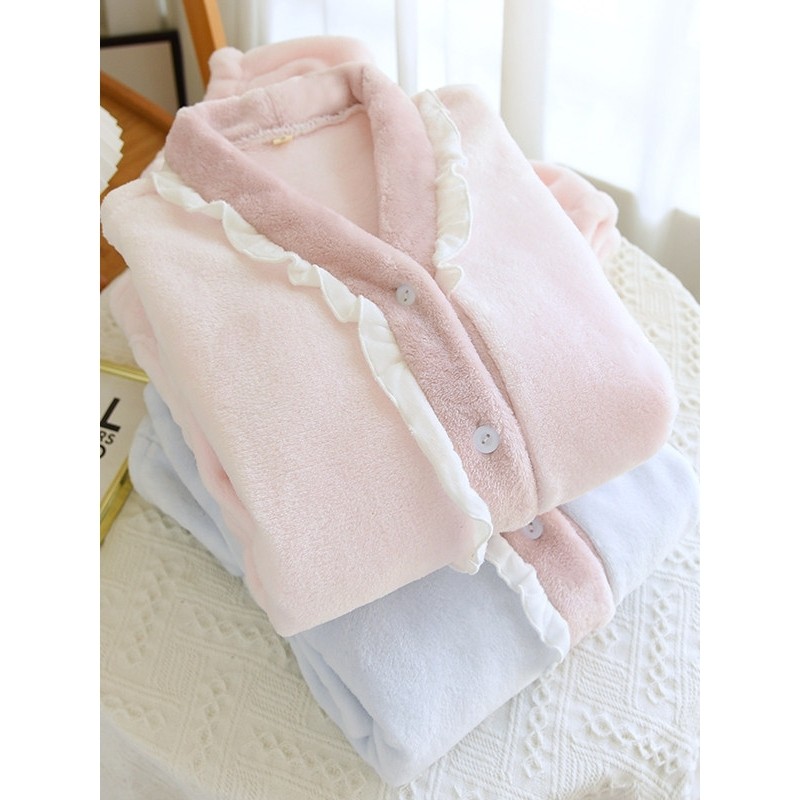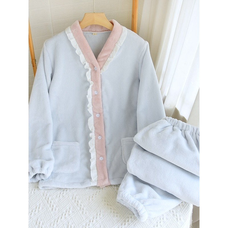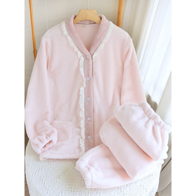 红豆珊瑚绒睡衣女秋冬季2025新款加绒加厚v领套装长袖大码冬天家