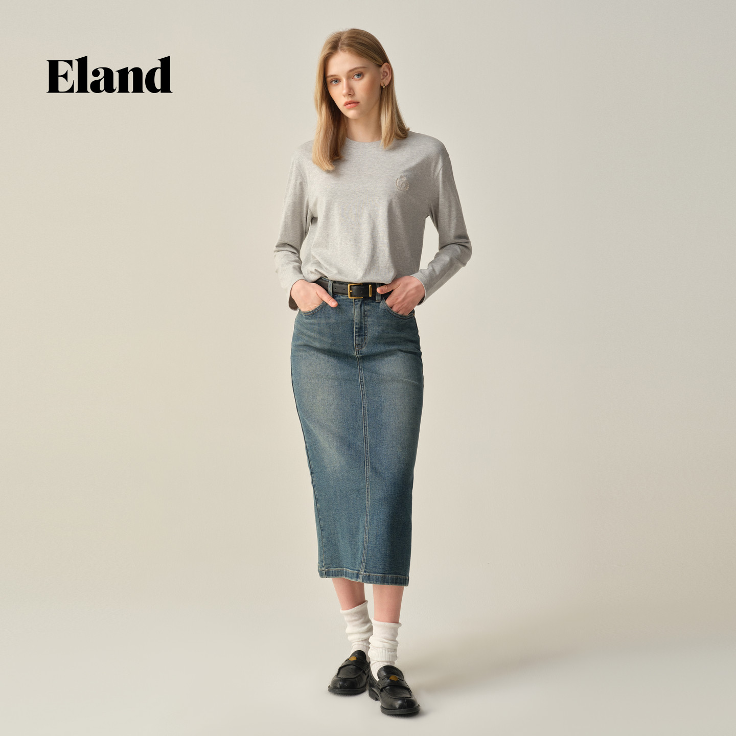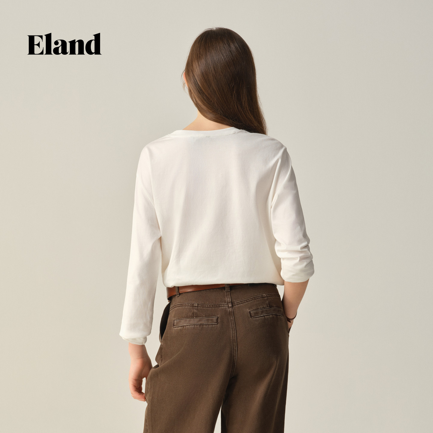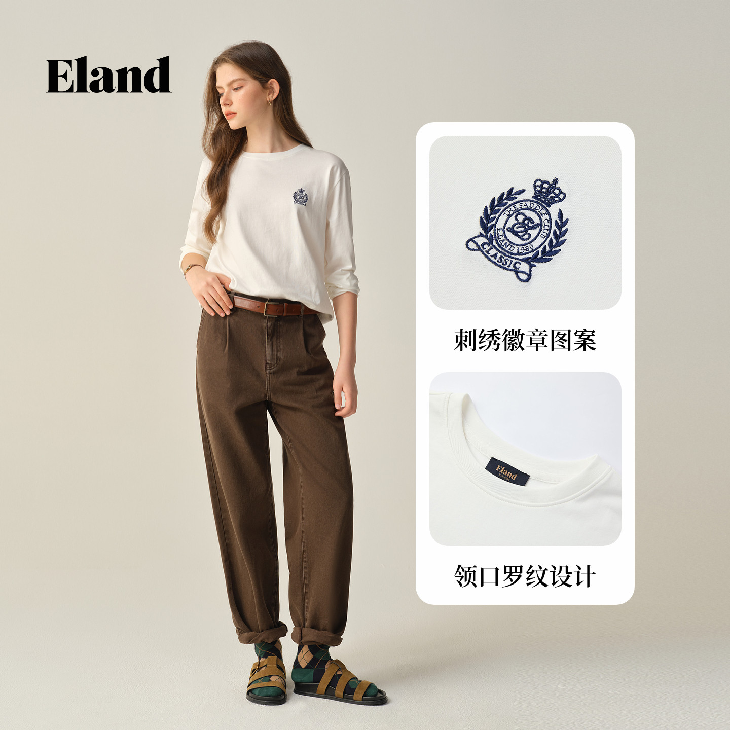 【100%棉】Eland衣恋T恤女圆领长袖纯色休闲上衣2025冬季新款