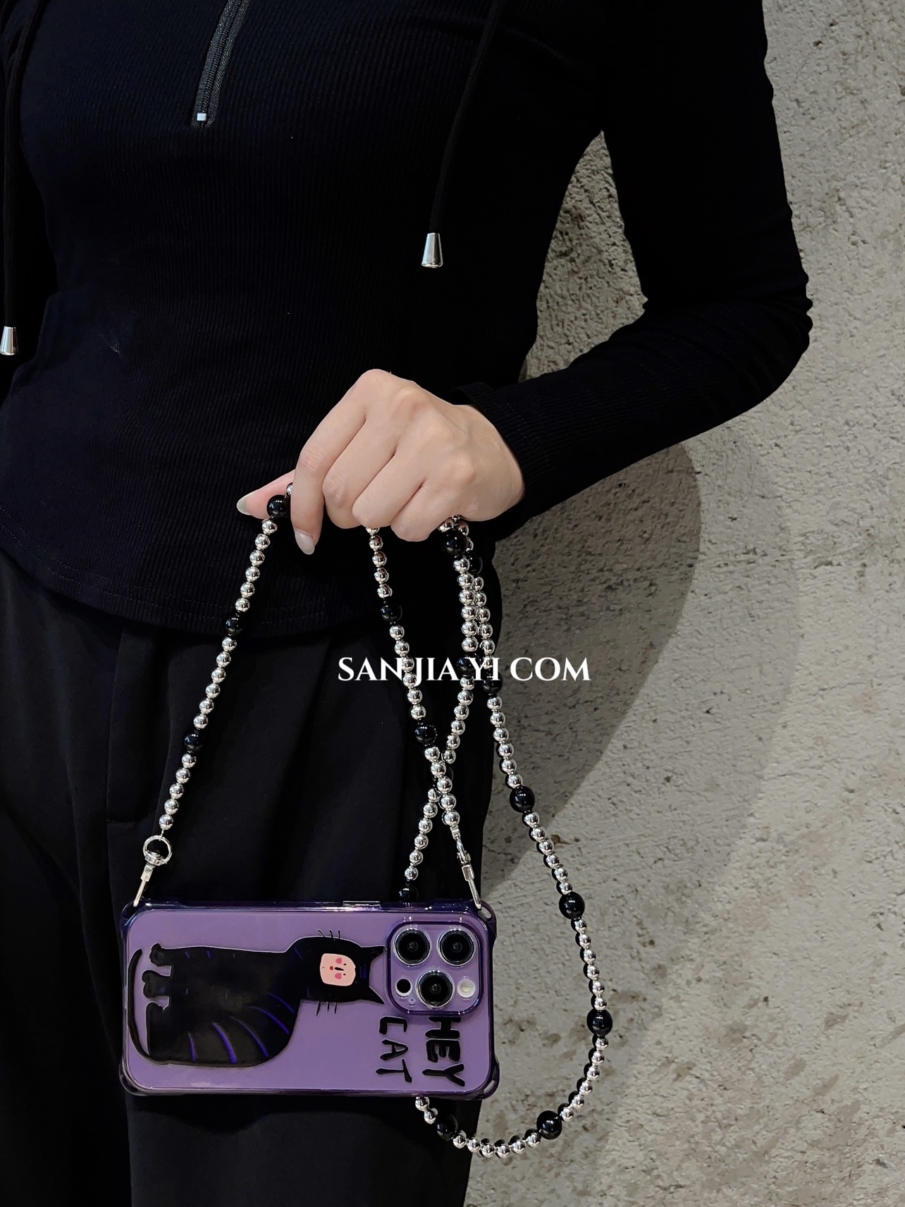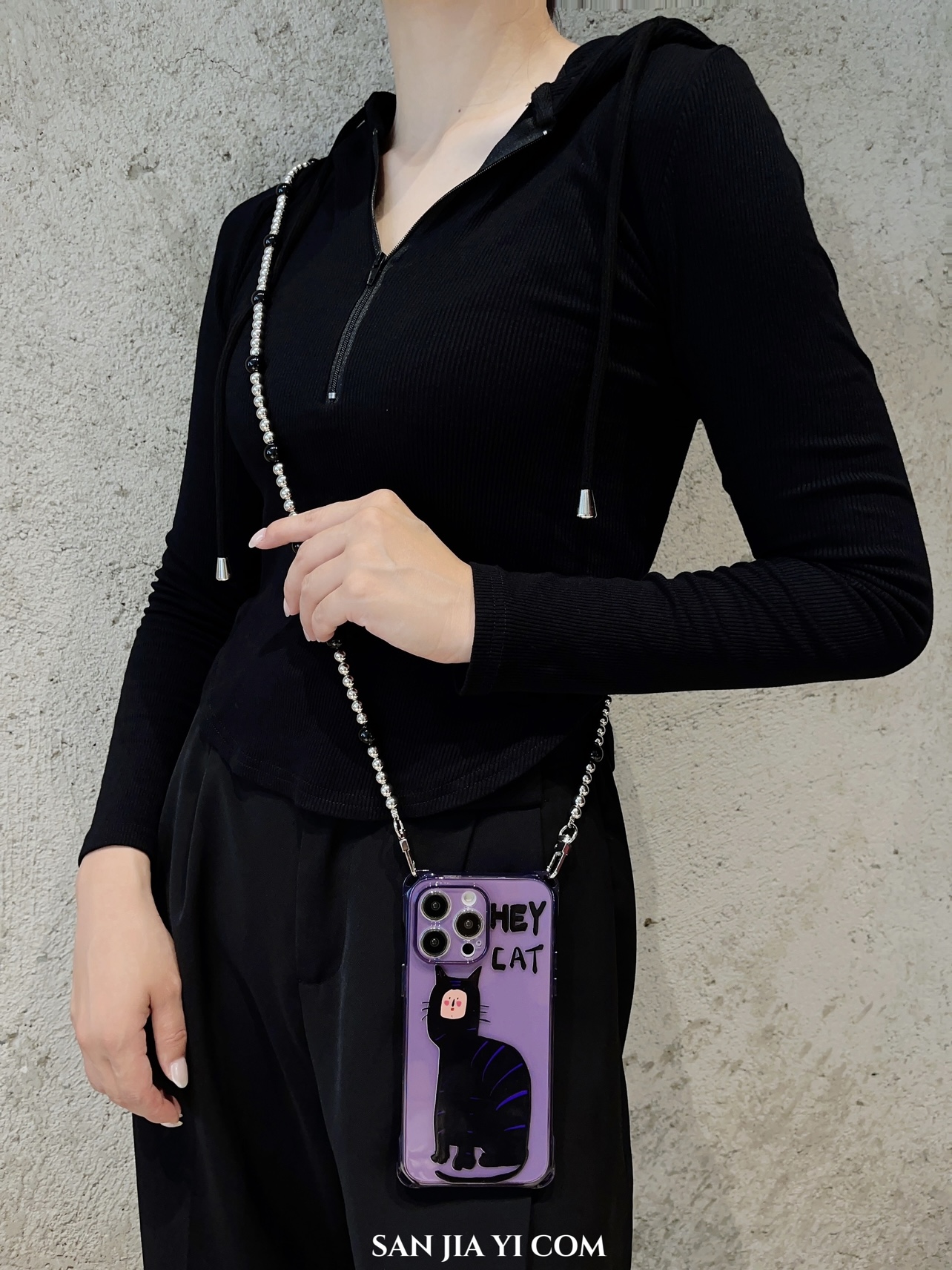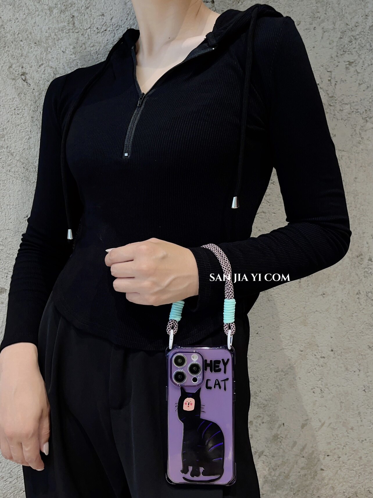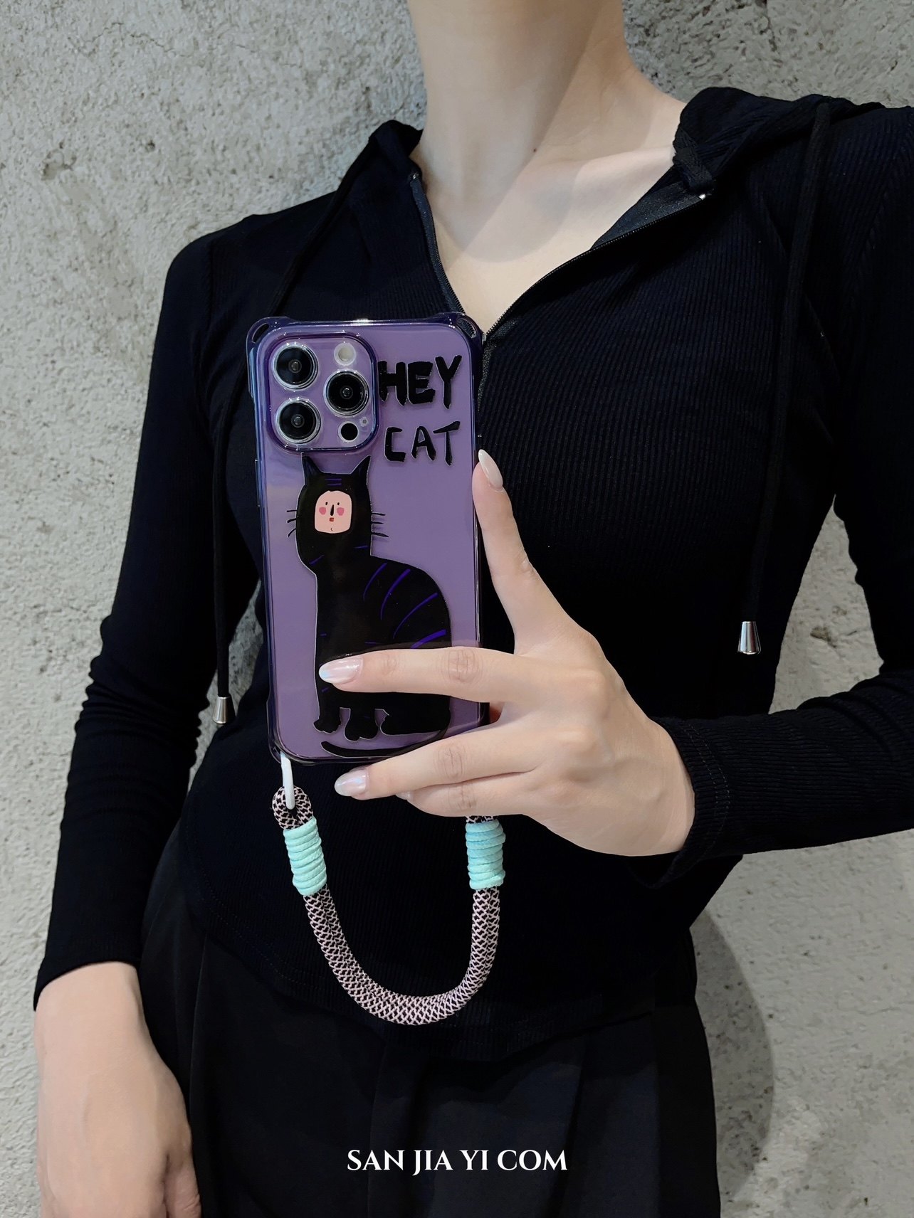 日韩有脸猫挂绳手机壳斜挎14plus暗夜紫时尚侧背可单肩背适用苹果iPhone13Promax创意12手提11防摔手腕新款xr