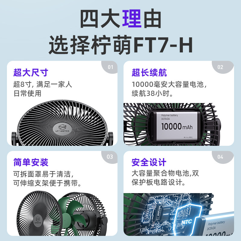 柠萌户外露营电风扇静音便携式超长续航家用桌面台式usb风扇野营帐篷大风力小型三脚架立式落地扇2024新款
