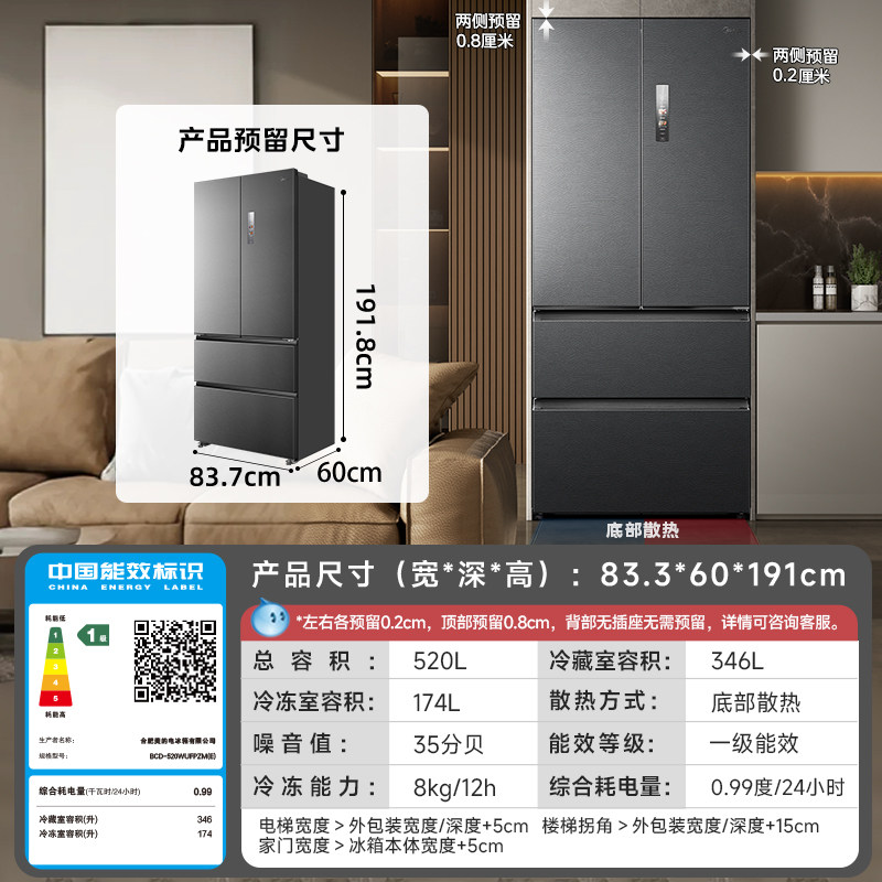 【政府补贴】美的M60小机皇520法式双系统冰箱零嵌入家用双开四门