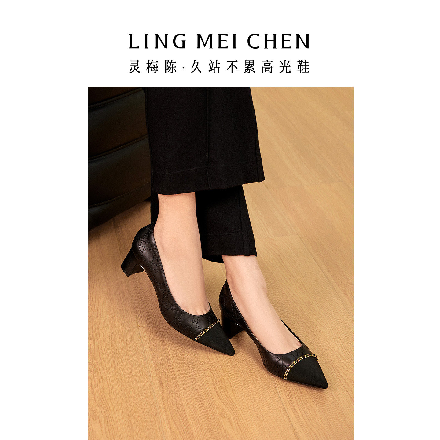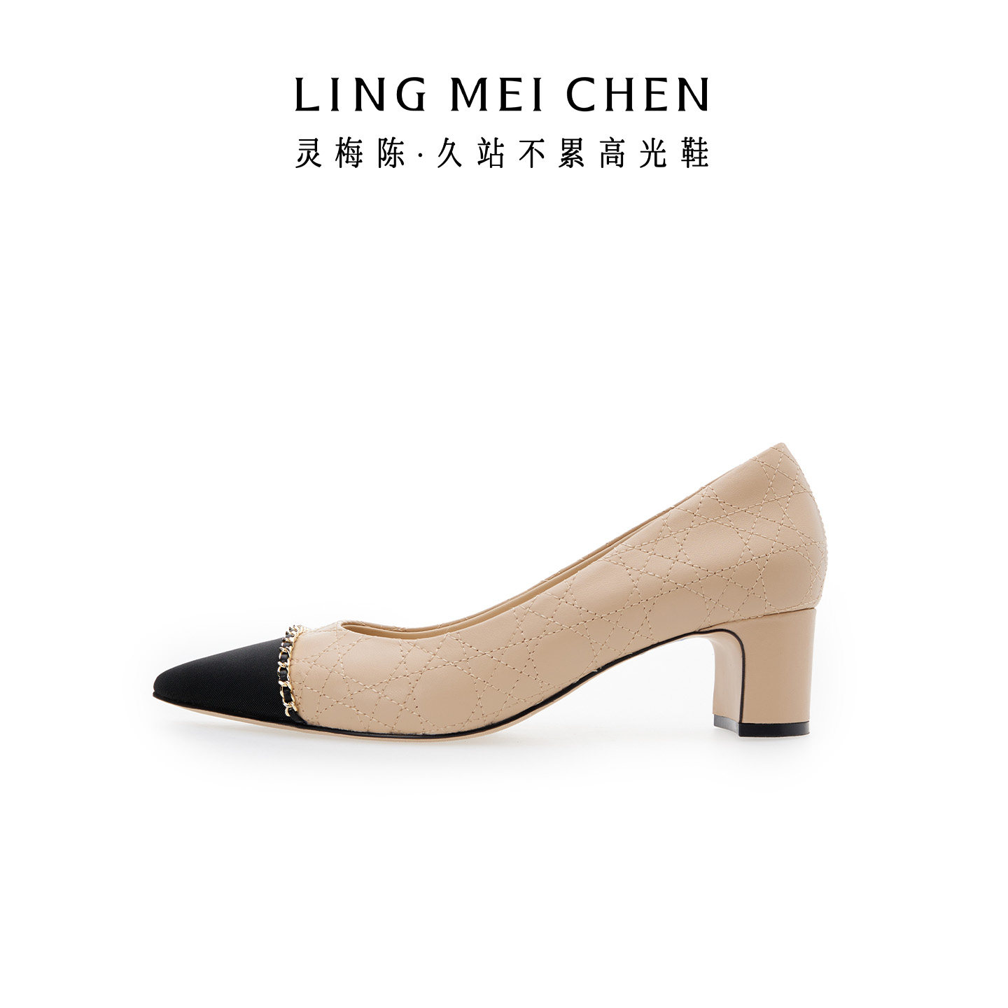 LINGMEICHEN小香风单鞋尖头拼色高跟鞋新款粗跟气质裸色中跟女鞋