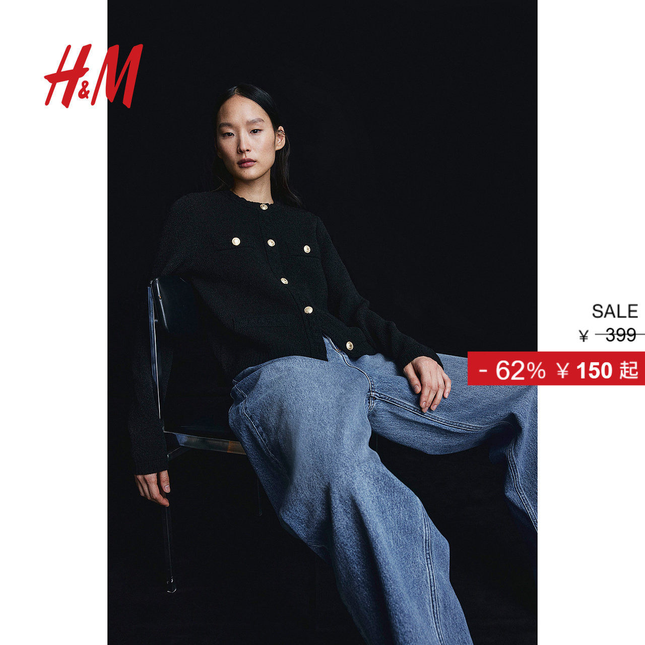HM女装针织开衫冬季千金小香风外套纹理感短外套1194323