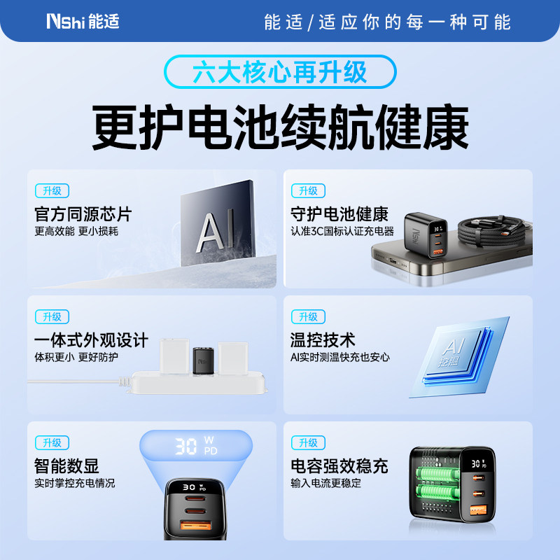能适新款智能数显充电器30W适用华为苹果小米vivo快充头三接口ipad平板pd超级闪充手机单头3C原装正品充电头