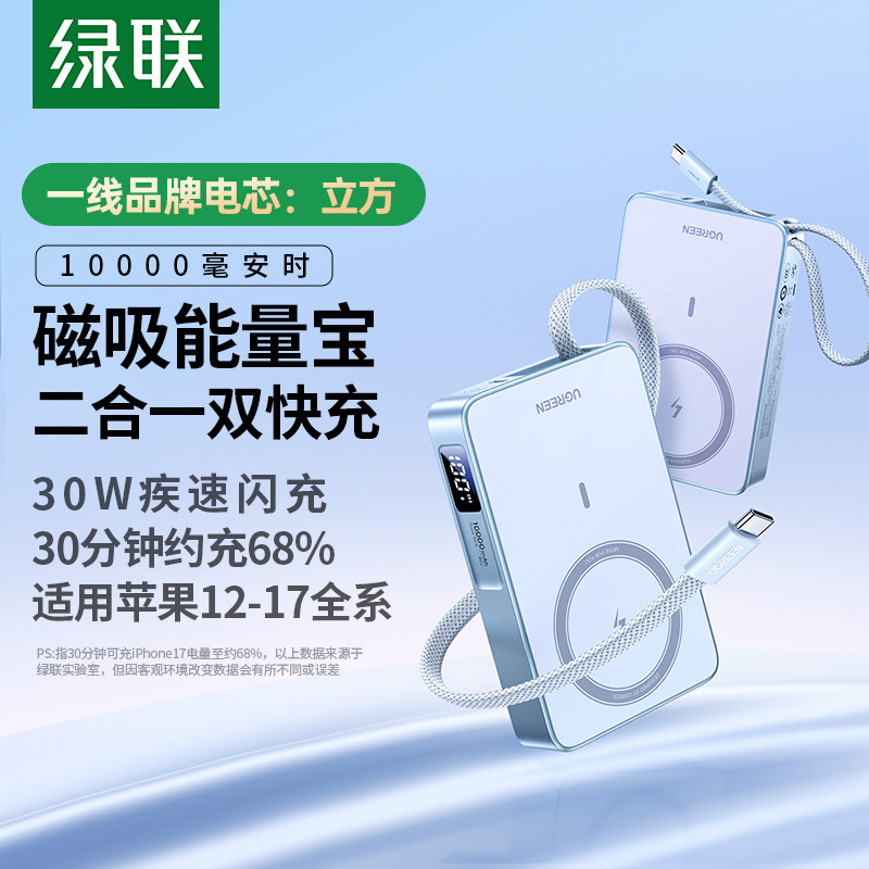 【充电宝3C认证可上飞机】绿联2026新款10000毫安30W磁吸无线充电宝自带线适用苹果17专用快充16便携移动电源
