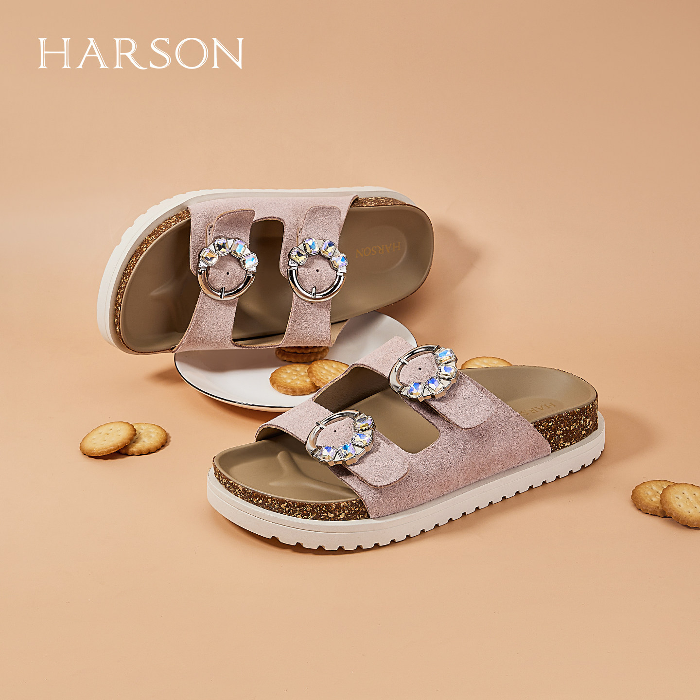 哈森时尚水钻双带扣一字拖女夏季清凉透气一脚蹬懒人拖鞋HM231901
