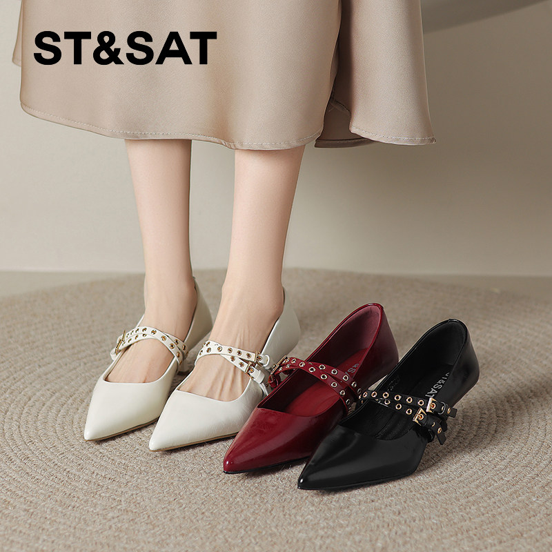 星期六黑色高跟鞋女2025年真皮尖头浅口猫跟鞋法式气质高级感单鞋