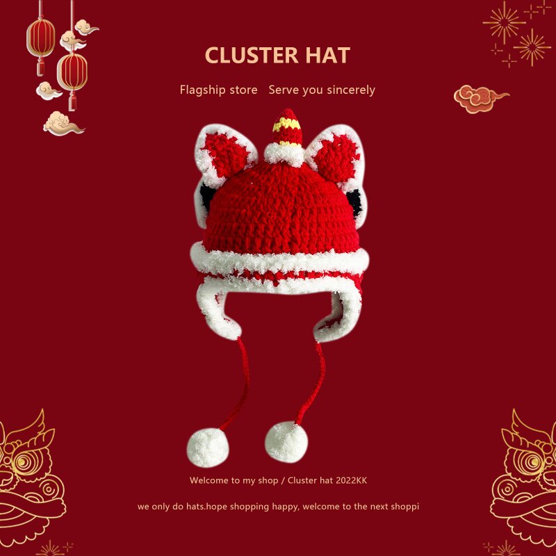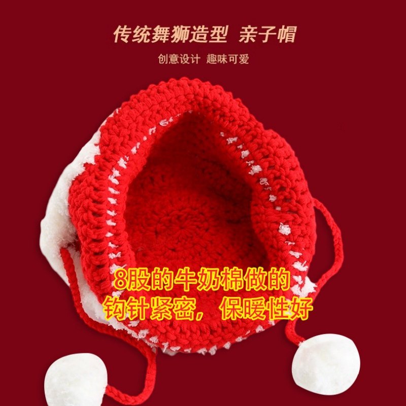 虎头帽钩针醒狮保暖帽子编织儿童舞狮国风亲子虎头帽宝宝毛线帽