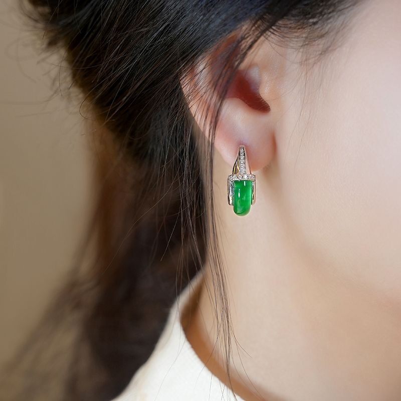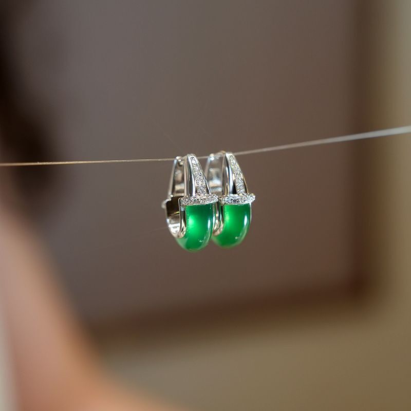 U形冰种阳绿仿翡翠耳坠女高端精致时尚复古银色镶嵌锆石设计耳饰