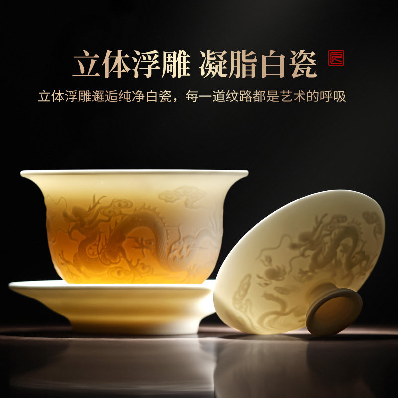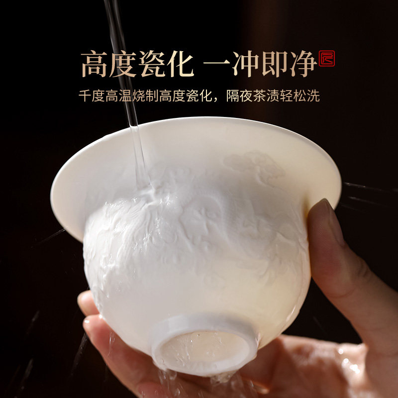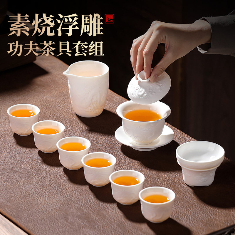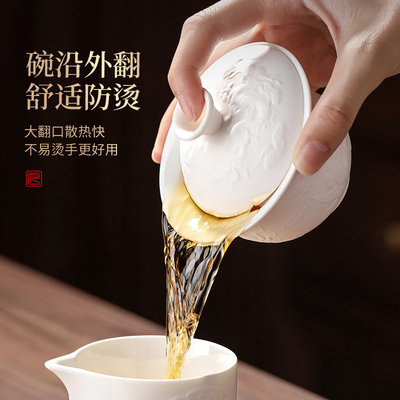 德化白瓷茶具套装家用泡茶轻奢高档手工浮雕盖碗茶杯茶碗功夫茶具