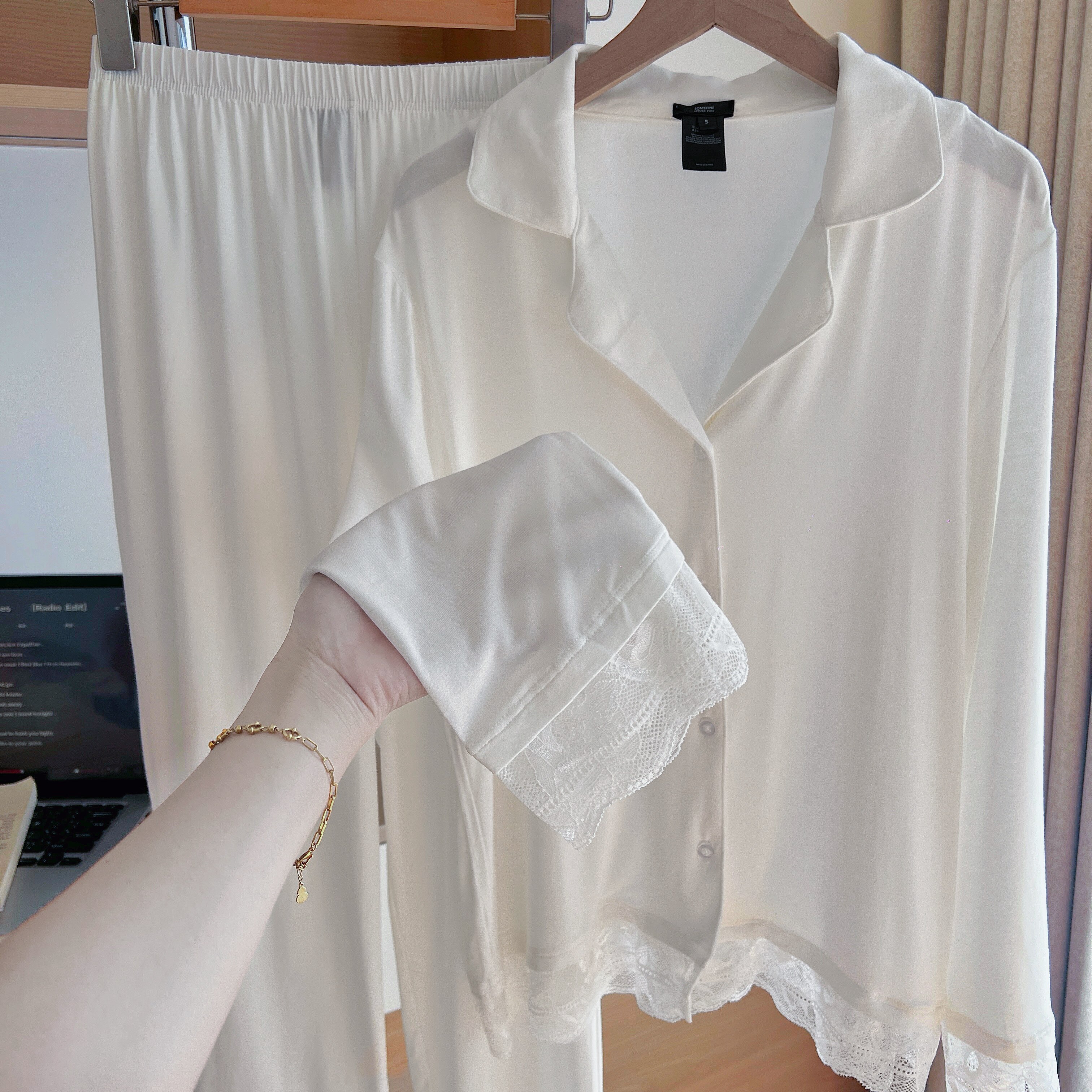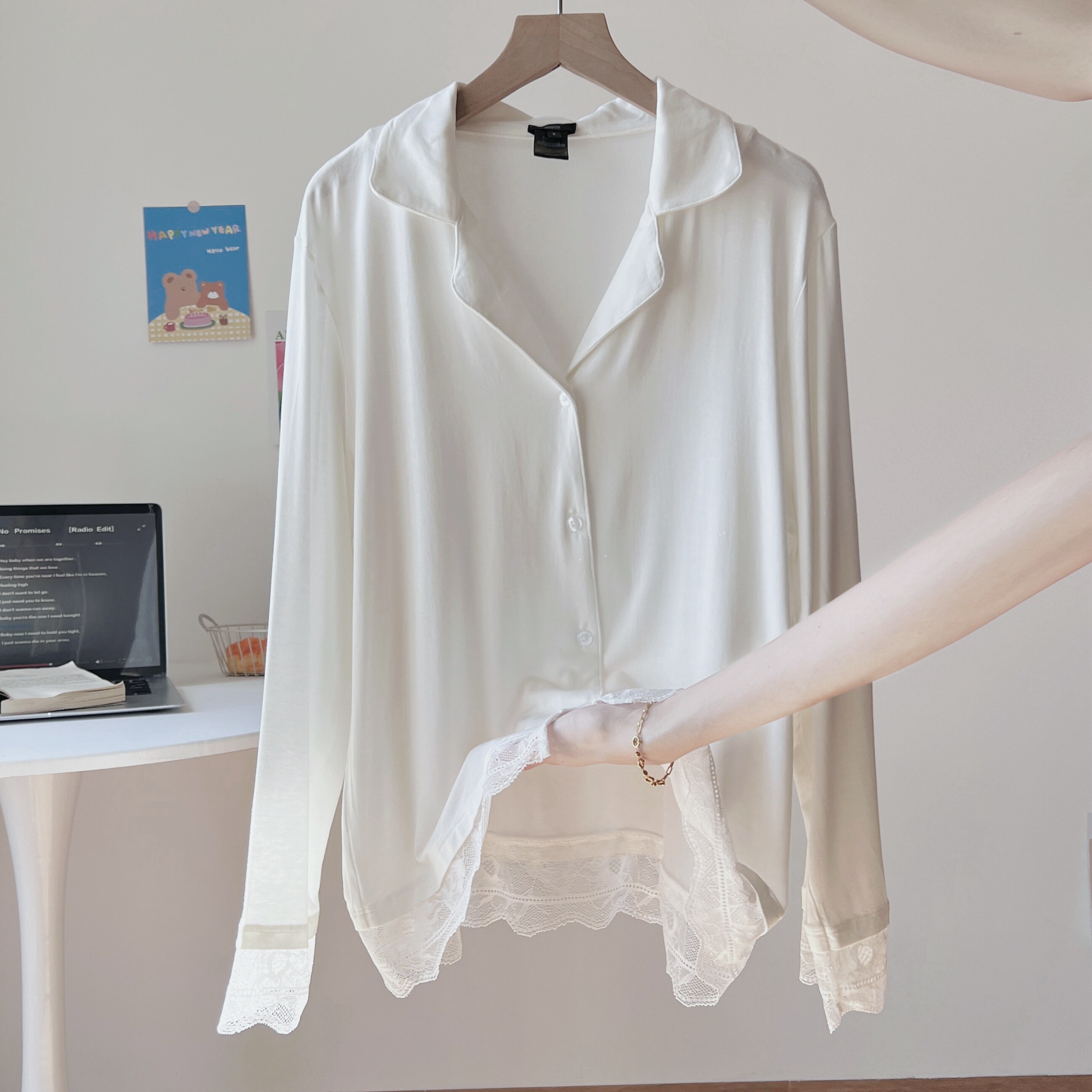 2025新款超柔软透气莫代尔睡衣女春秋季蕾丝拼接衬衫领家居服套装