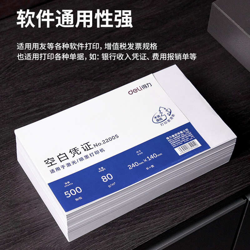 得力22005空白凭证纸22005针式打印财务专用210-120会计凭证白纸240x140mm适用用友金蝶等各类软件打印80g
