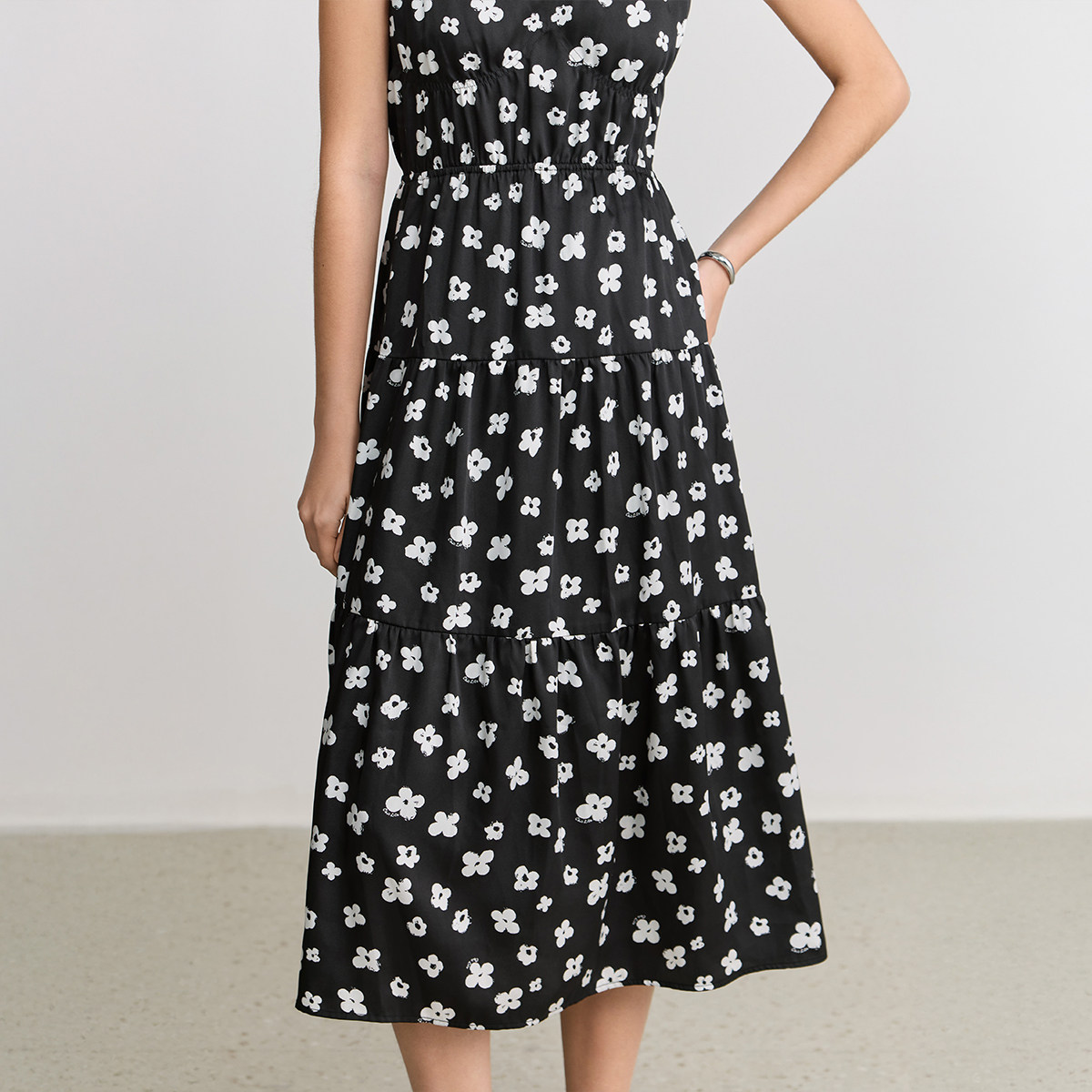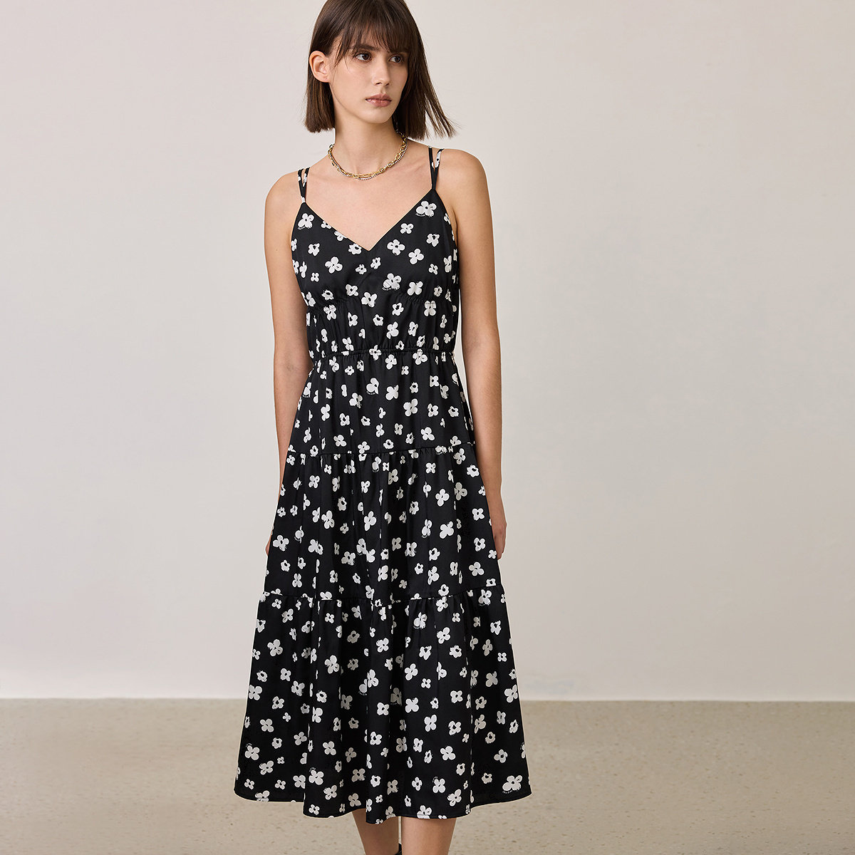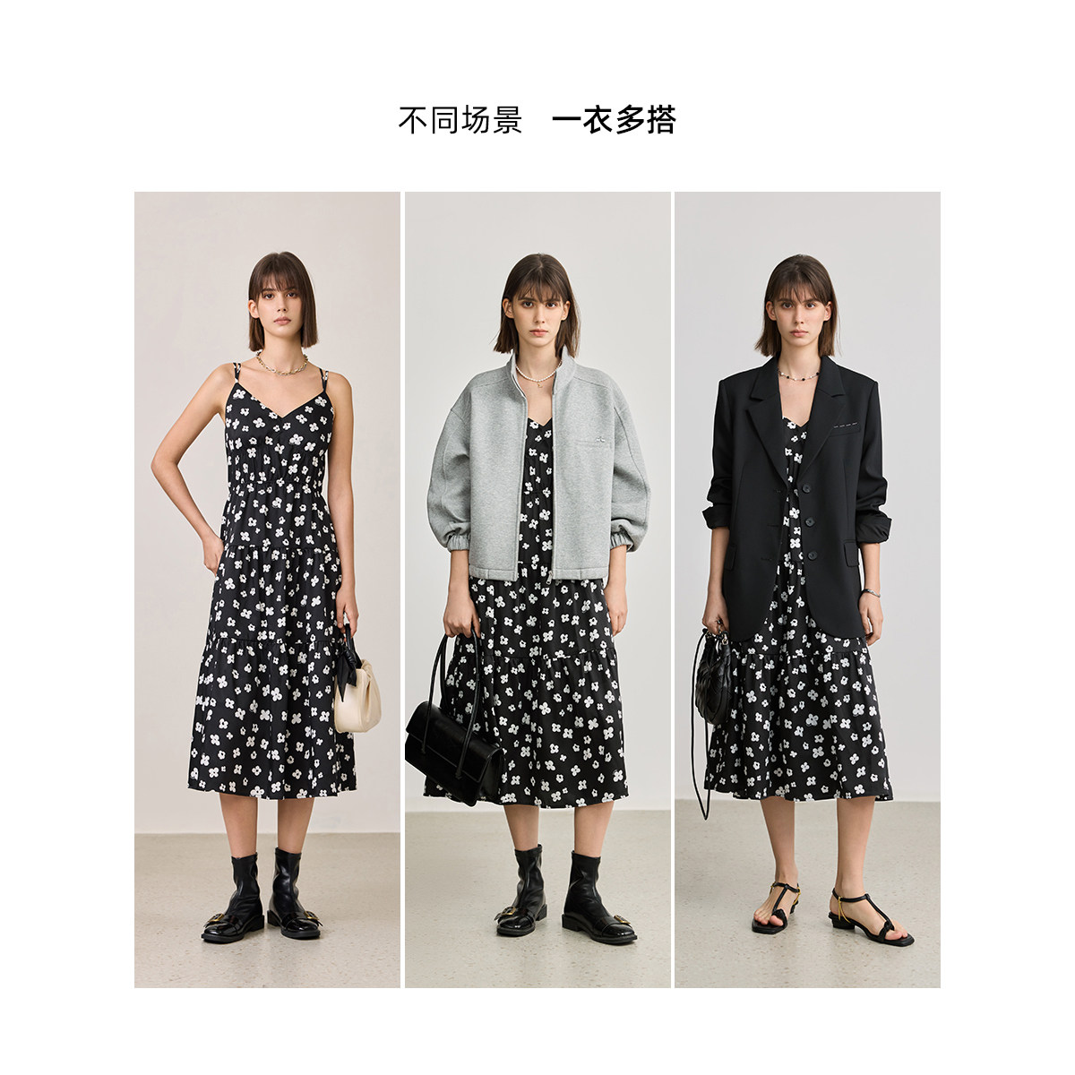 【幸运裙】LILY2025新款女装撞色黑白碎花裙V领收腰吊带连衣裙