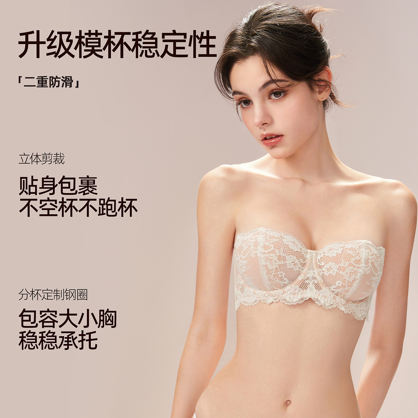 好奇蜜斯无肩带内衣女防滑蕾丝抹胸薄夏大胸显小文胸罩套装裹胸白