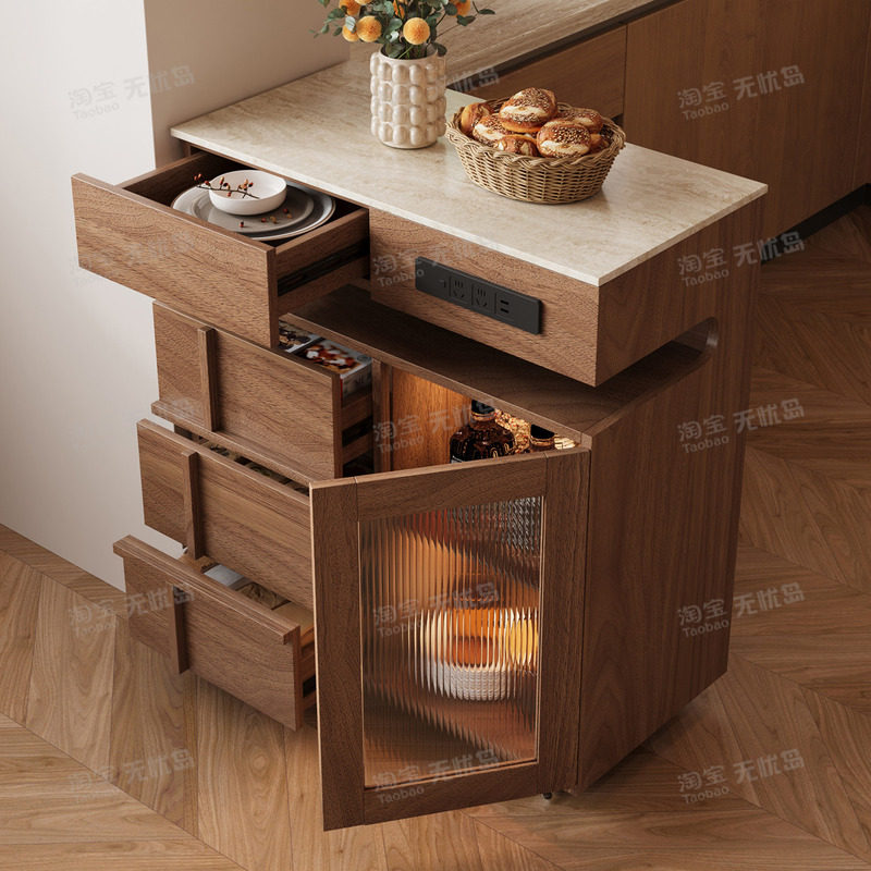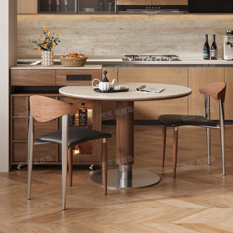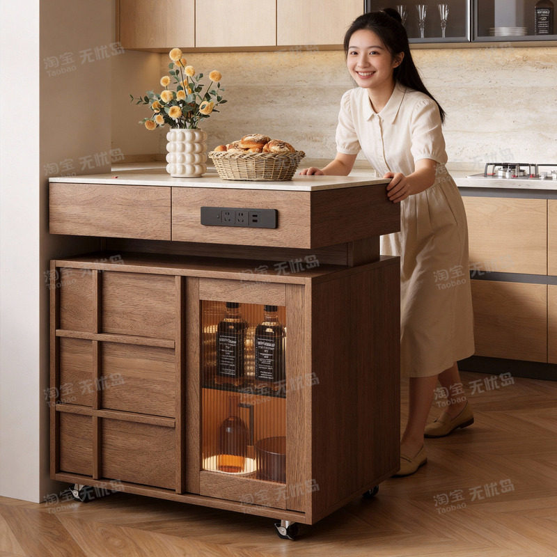 分离式岛台圆餐桌一体伸缩家用中古风厨房餐厅高级感实木餐岛一体
