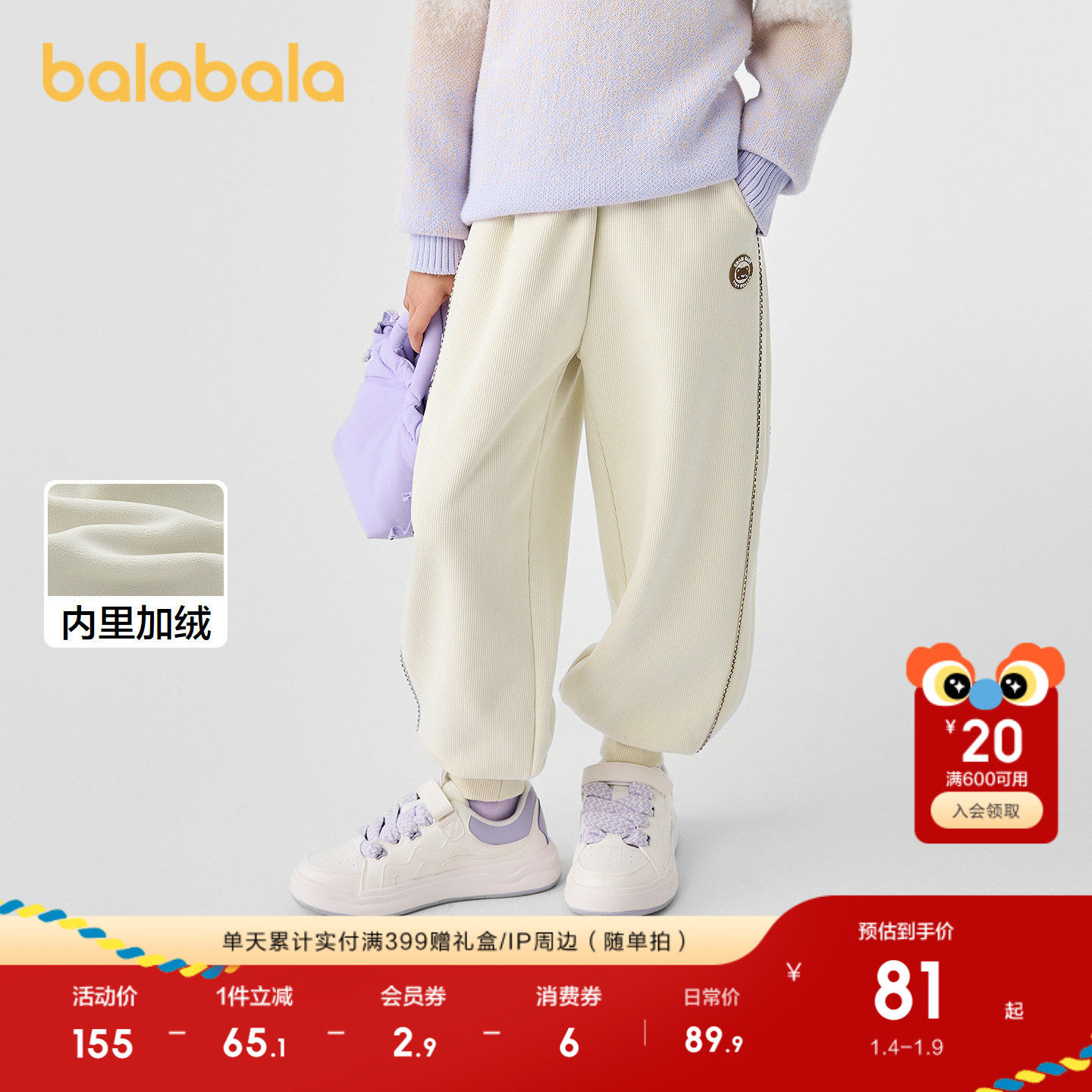 巴拉巴拉童装女童裤子儿童秋冬装慢跑裤绣花加绒长裤休闲运动百搭