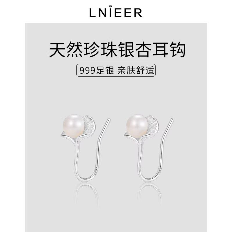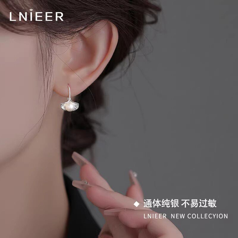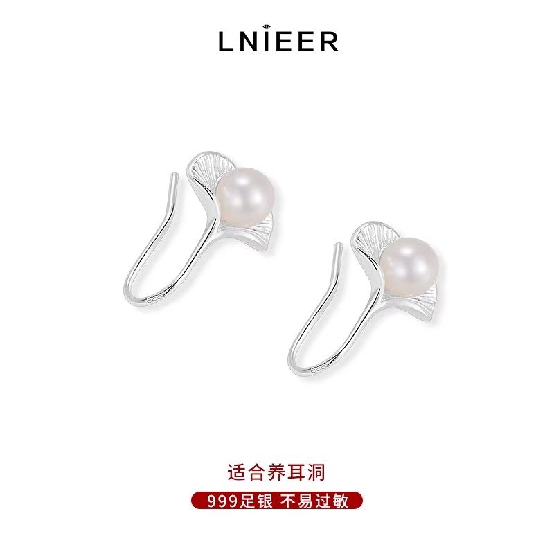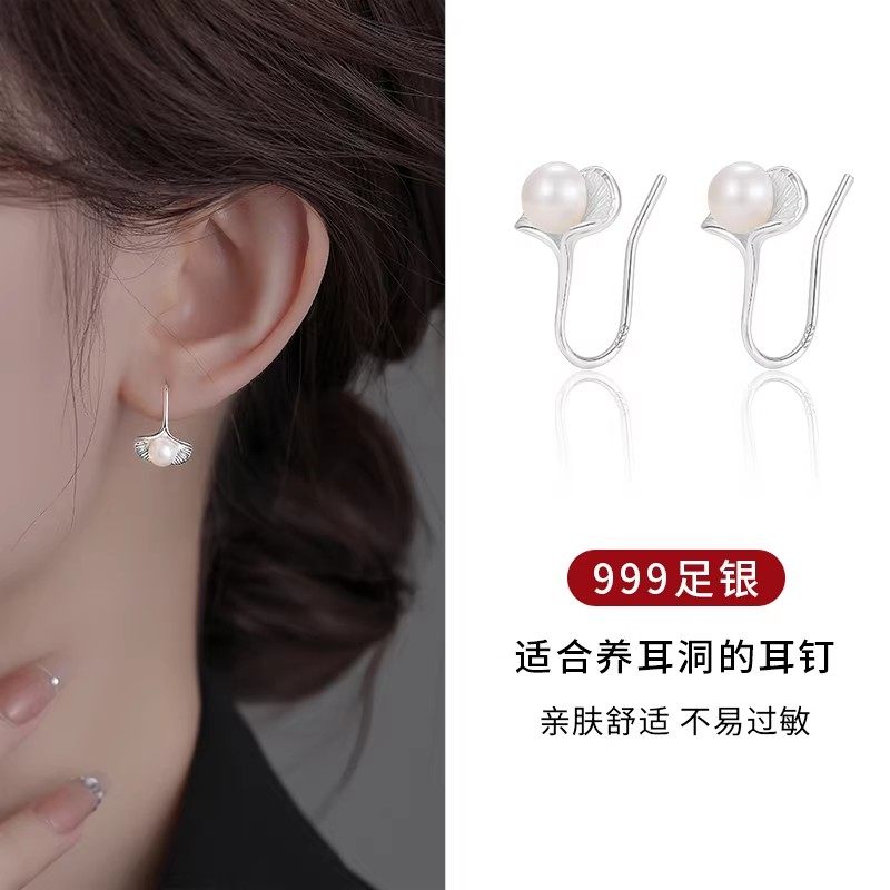 S999纯银有杏银杏叶耳钉淡水珍珠耳环轻奢高级感耳钩爆款耳饰白色