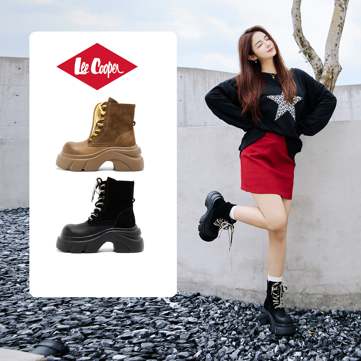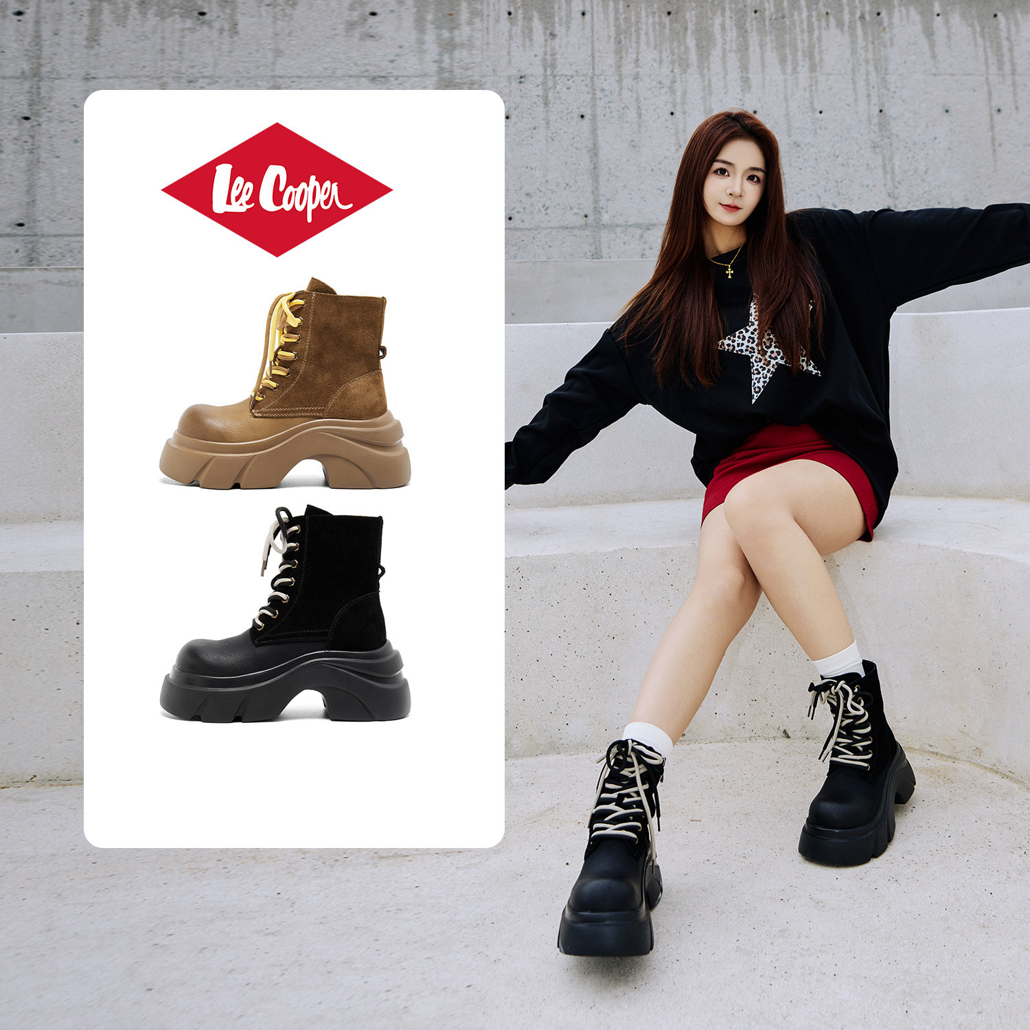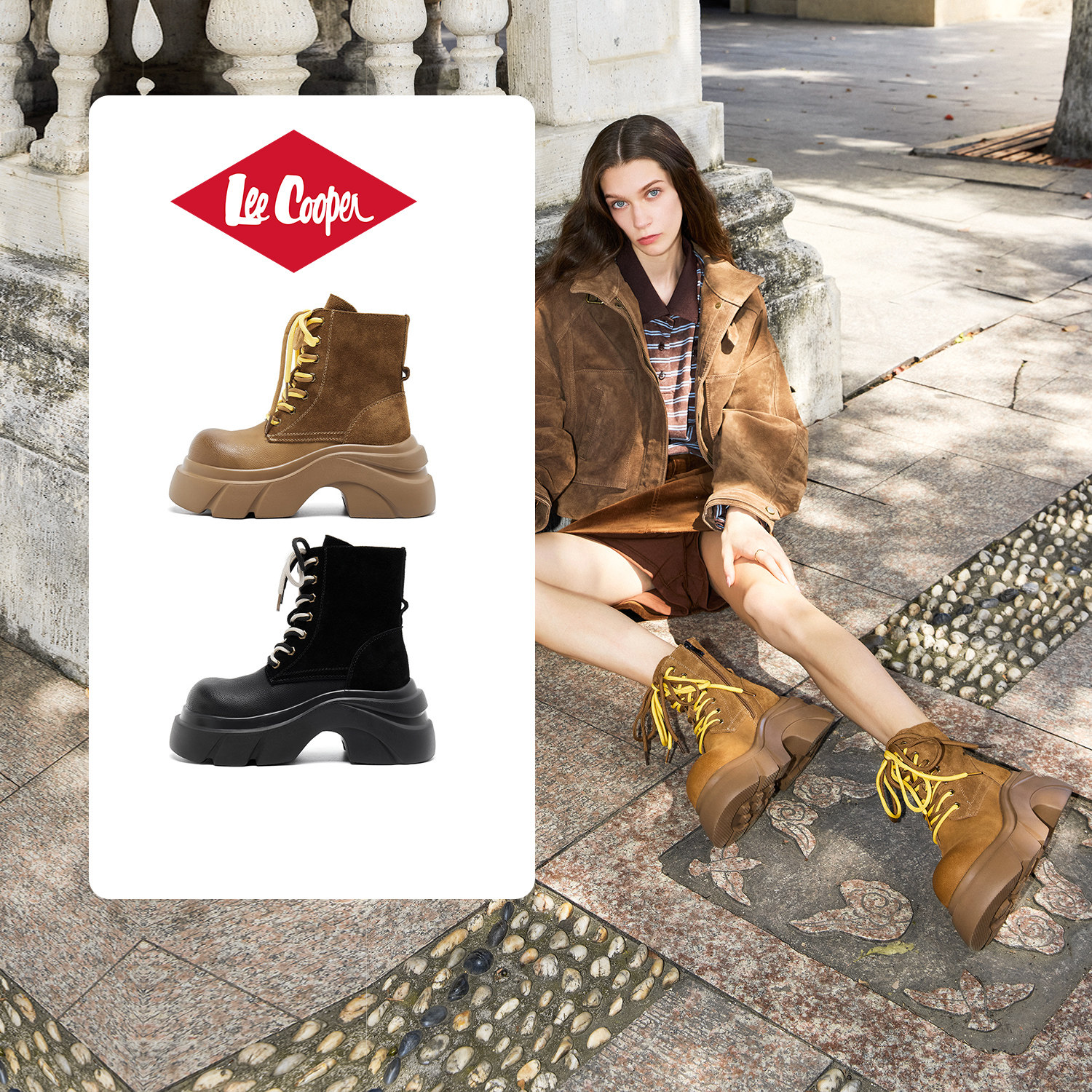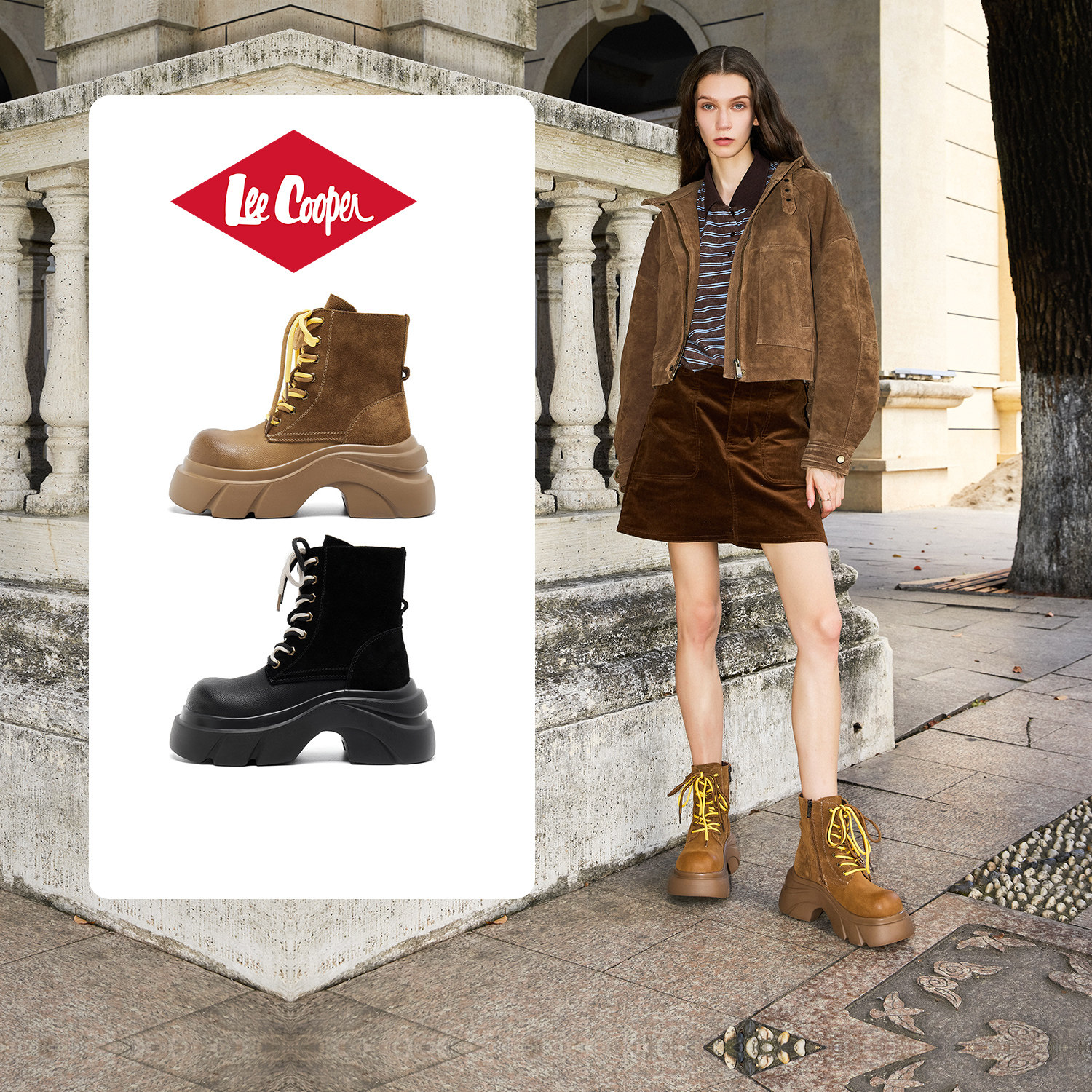 Lee Cooper厚底马丁靴女款2025新款秋季复古真皮绒面增高户外靴子