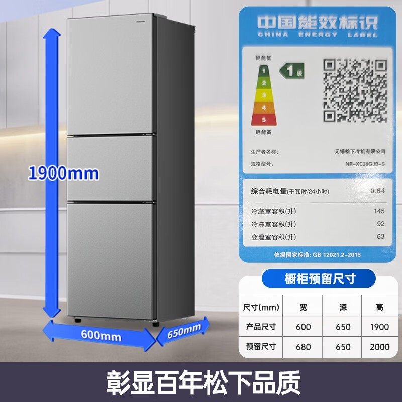 松下Xtra蔓越莓冰箱NR-XC30GJB-S/NR-XC30GEB-W三门风冷+制冰一级
