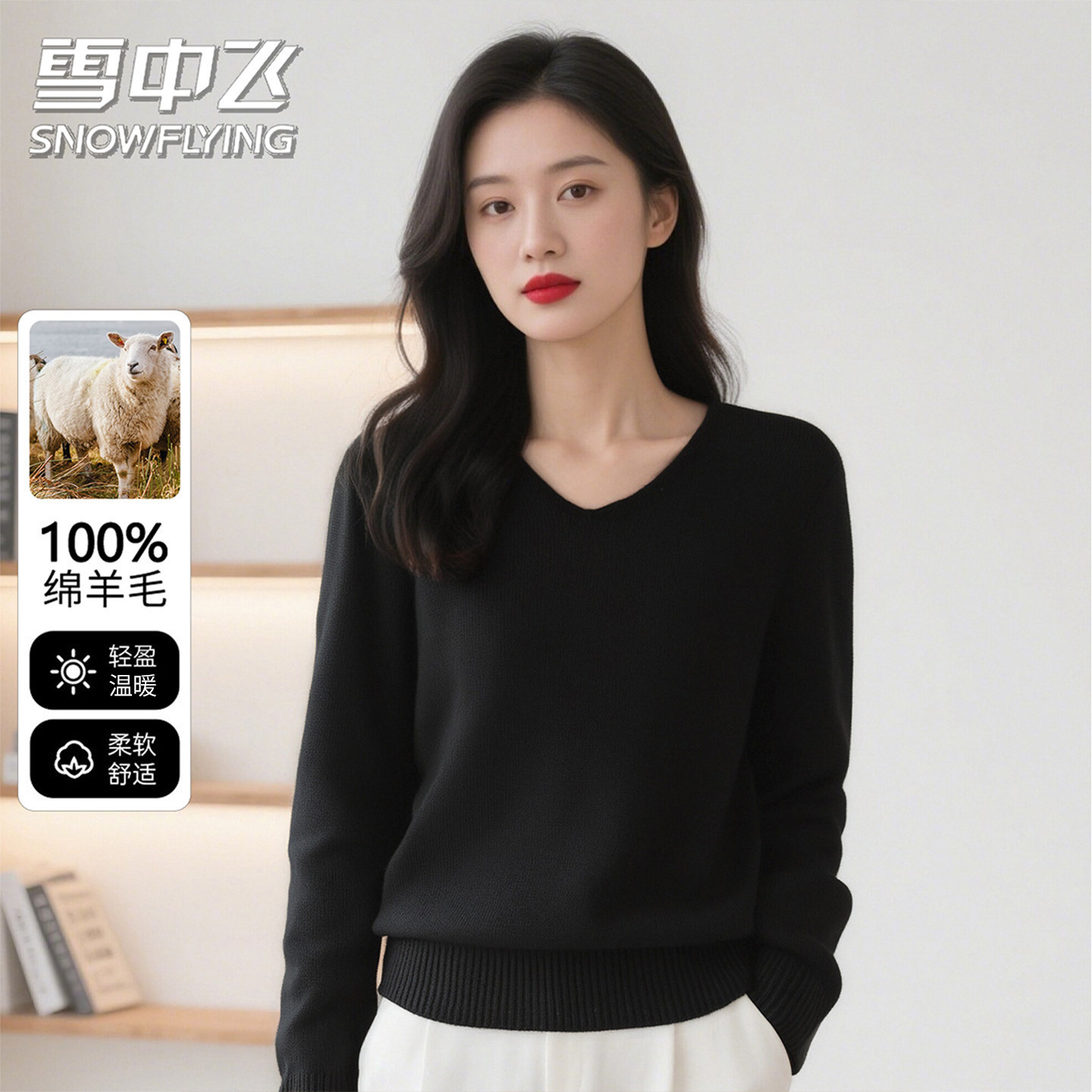 雪中飞【100%绵羊毛】秋冬厚款V领羊毛衫女纯色休闲长袖女式毛衣W
