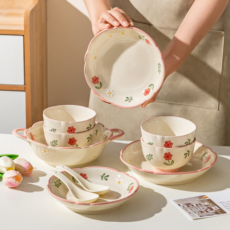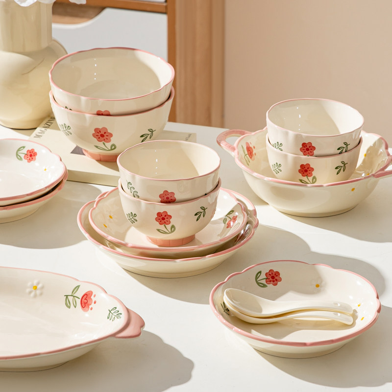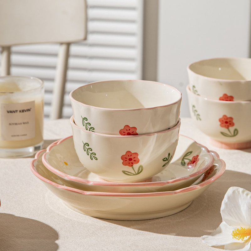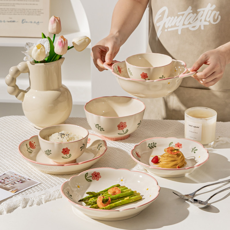 奶油风陶瓷碗家用卡通菜盘子可爱米饭碗汤碗釉下彩儿童餐具耐高温