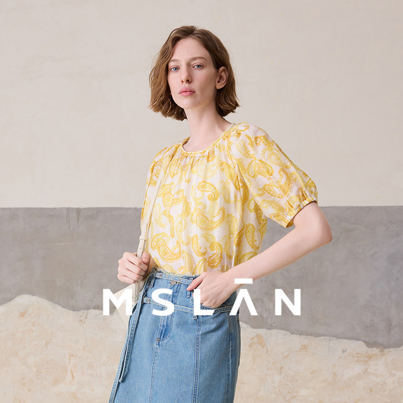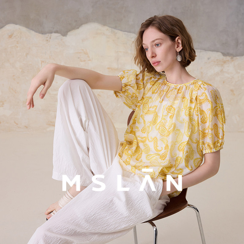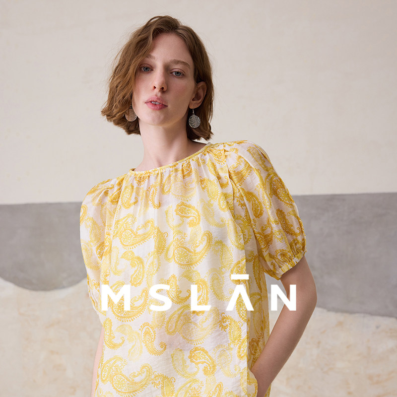 波西米亚/MSLAN飘逸度假风 腰果花圆领泡泡袖雪纺衫女MGBN523