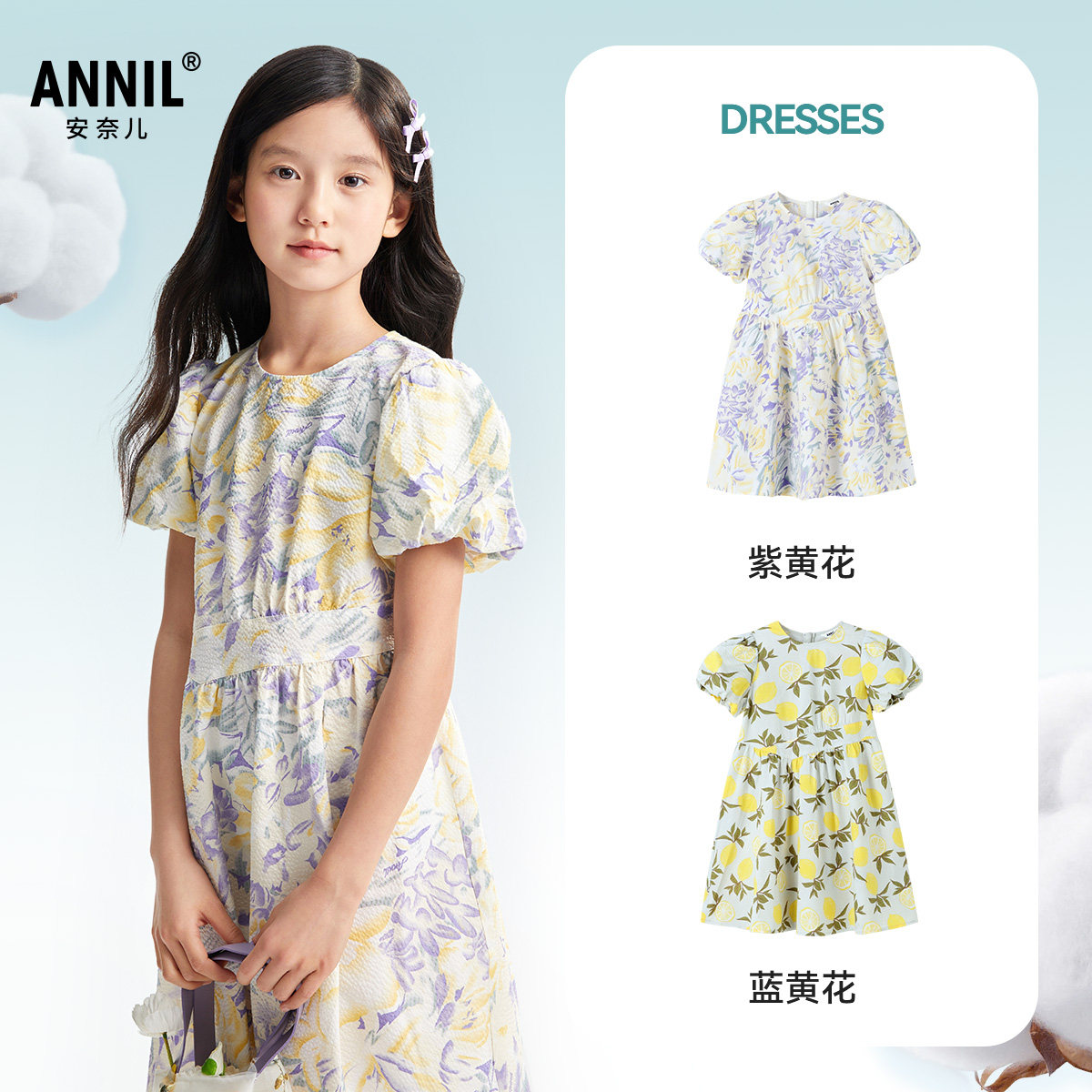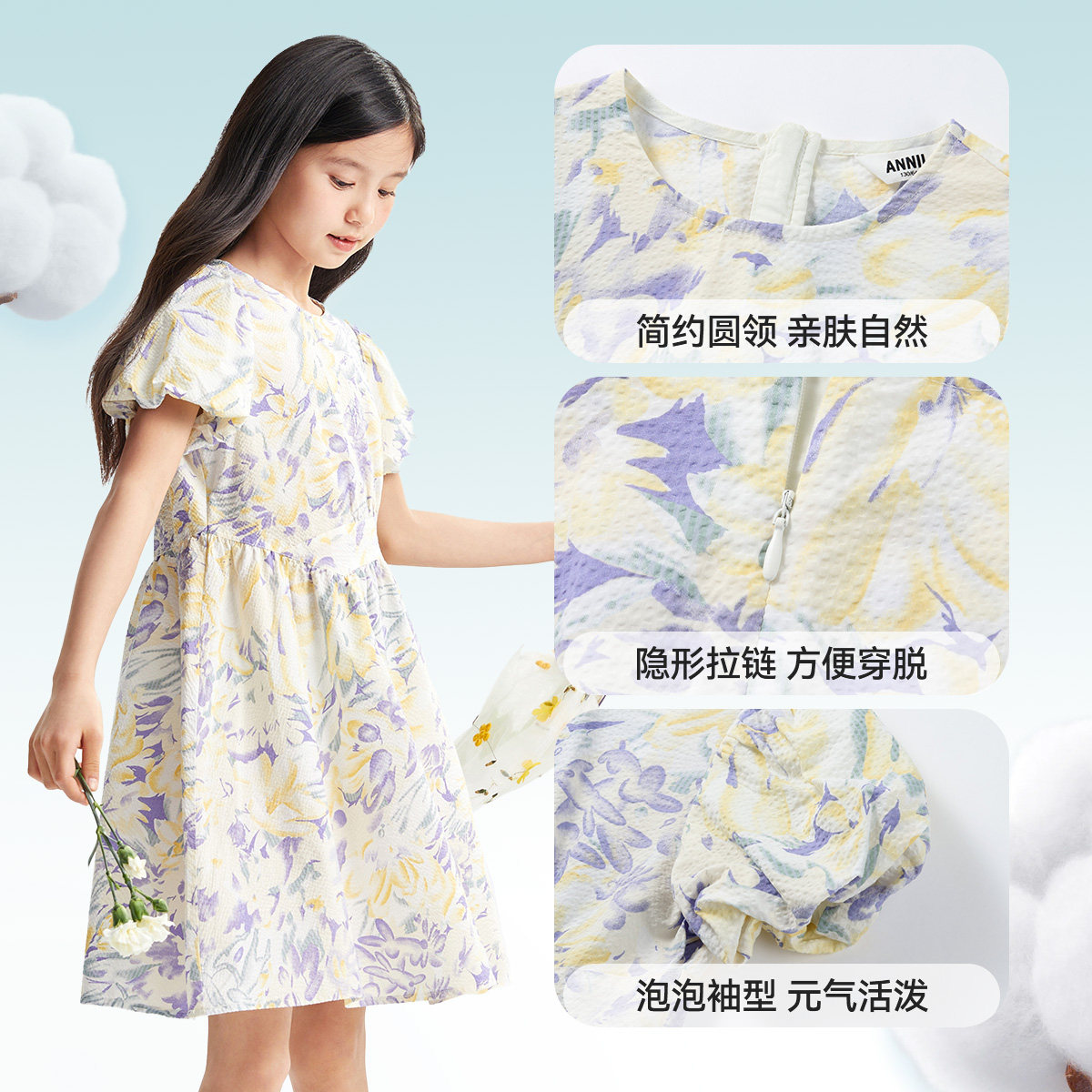 安奈儿童装女童连衣裙2025夏新款纯棉清新甜美吸湿透气泡泡裙子