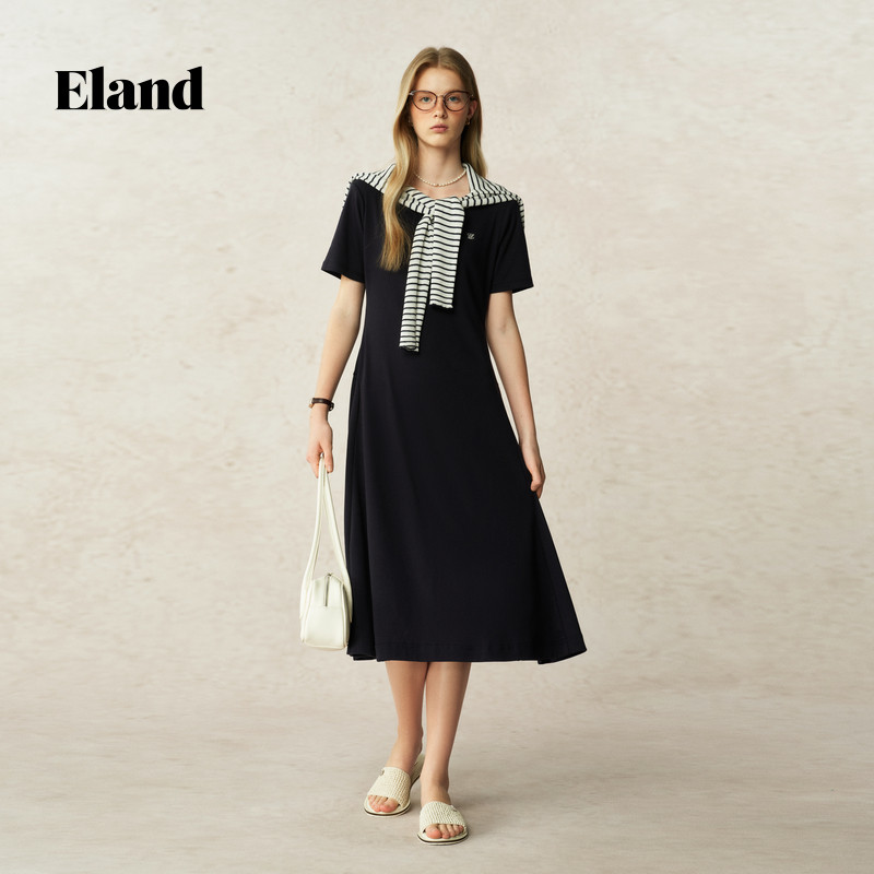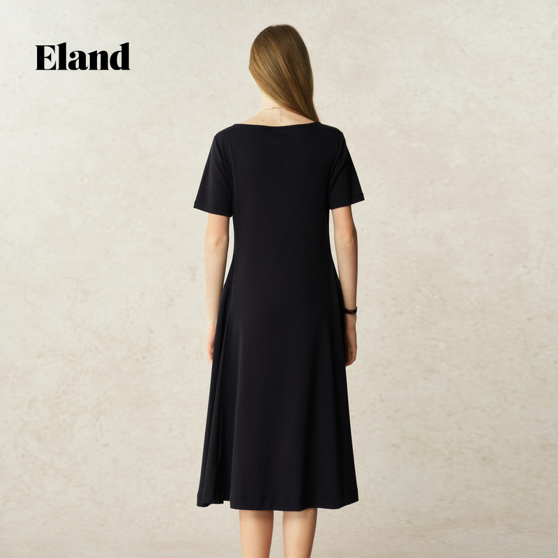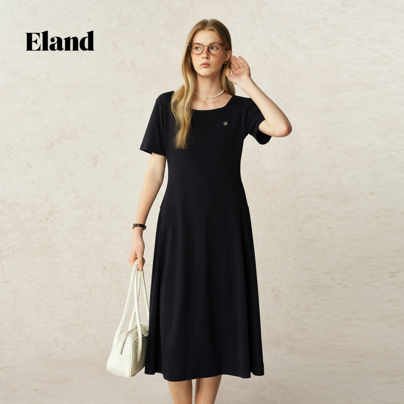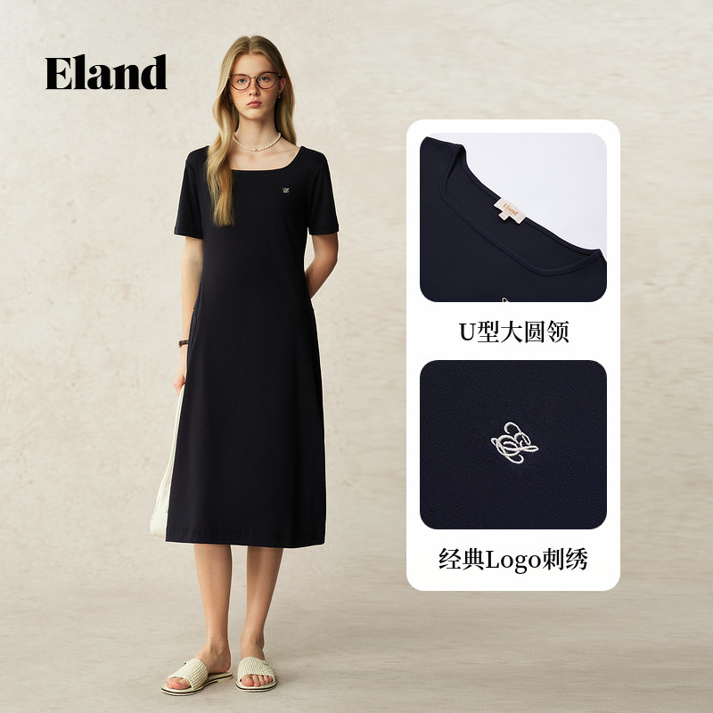 【66%棉】Eland衣恋连衣裙女纯色大u形领短袖裙子2025夏季新款