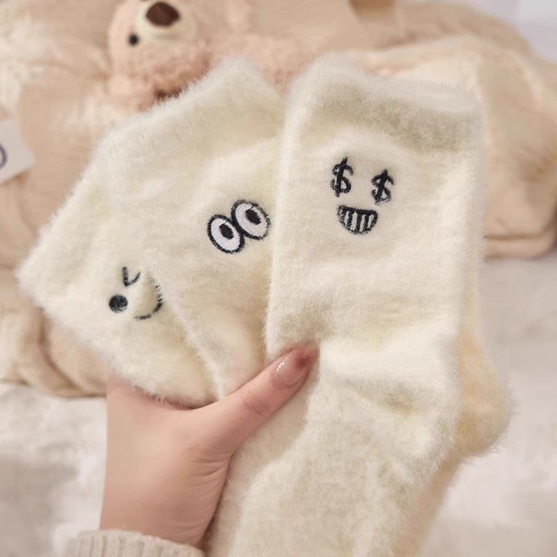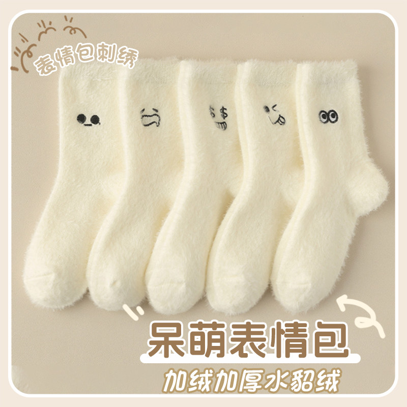 袜子女秋冬季保暖水貂绒睡眠居家袜刺绣搞怪冬天女士中筒加绒可爱