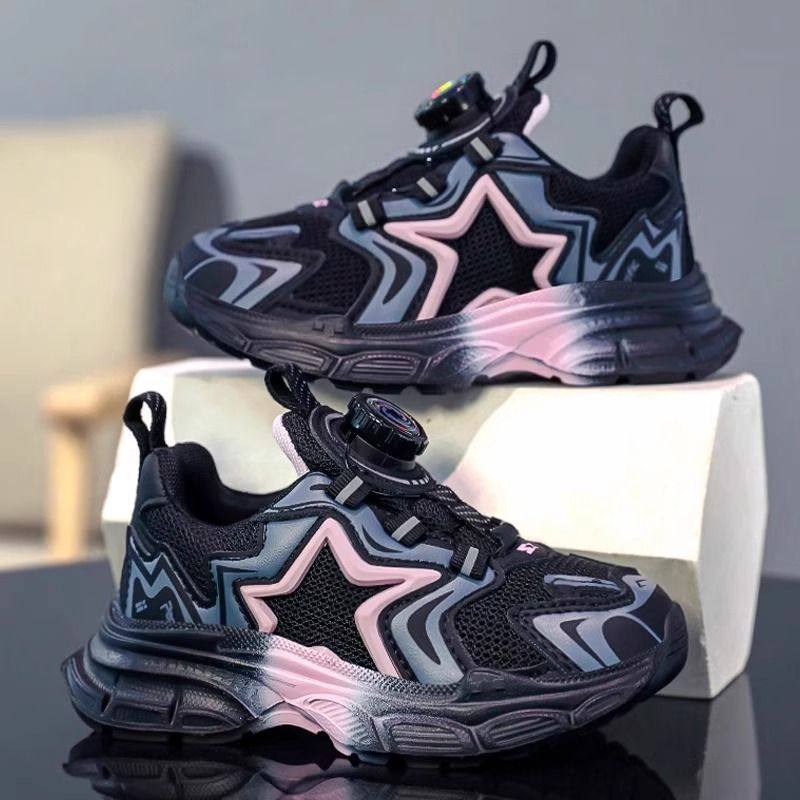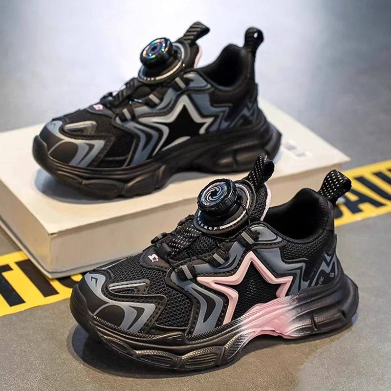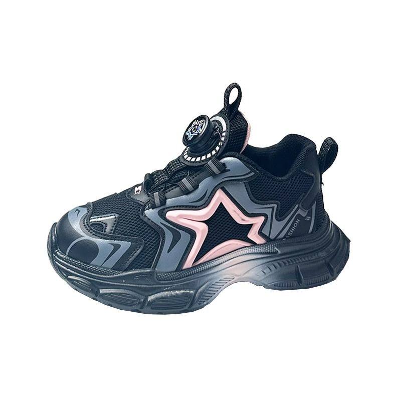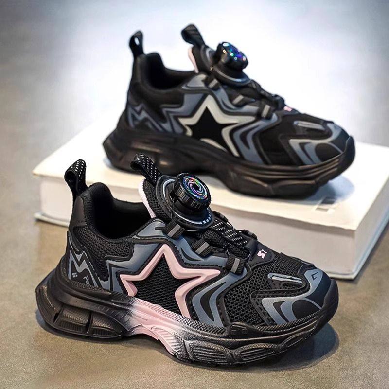 巴布豆女童鞋2025秋季新款儿童软底运动鞋黑色旋转纽扣老爹鞋防滑