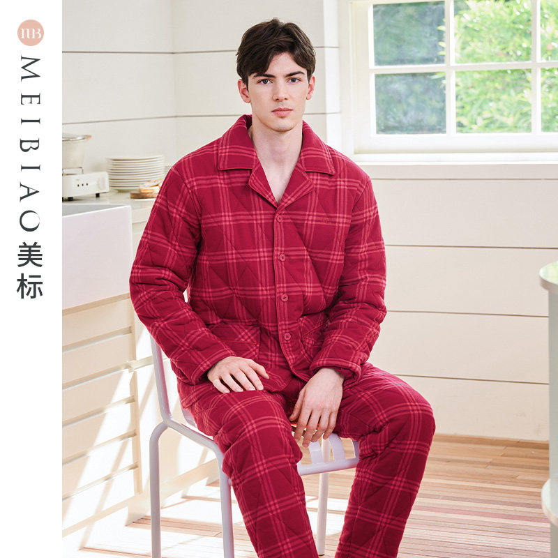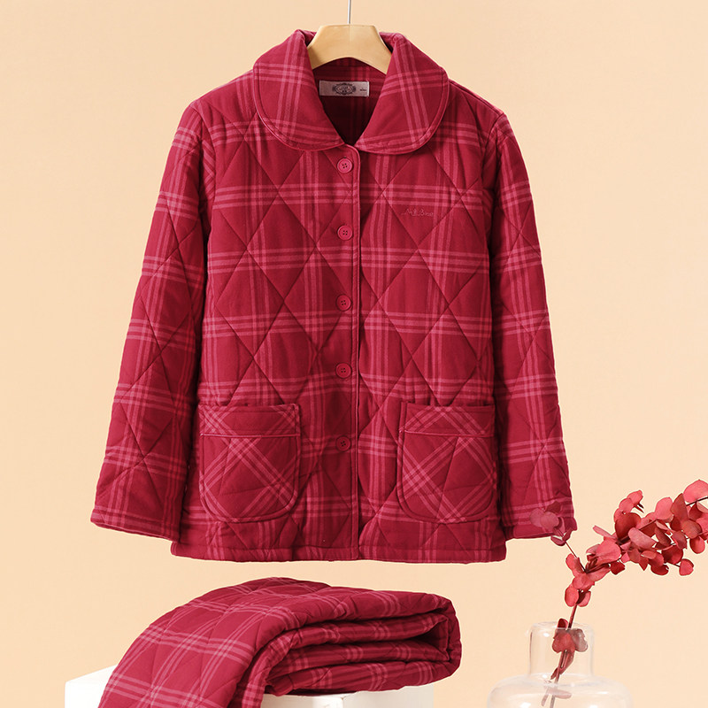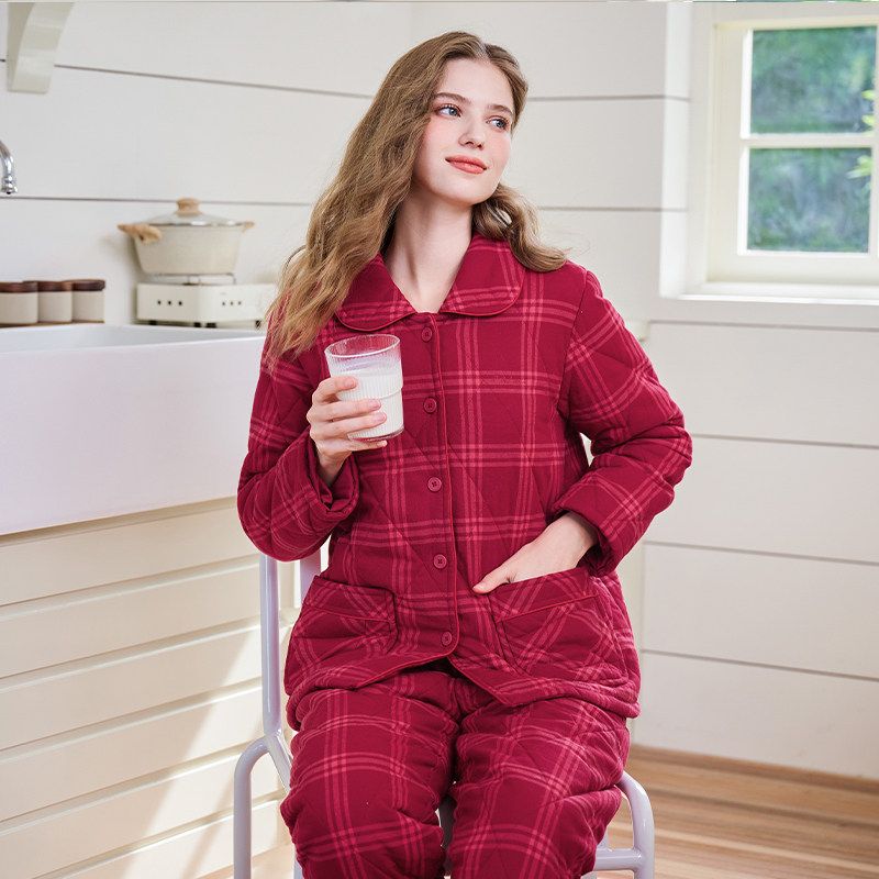 美标情侣三层加厚夹棉睡衣套装女秋冬红色结婚纯棉全棉格家居服男