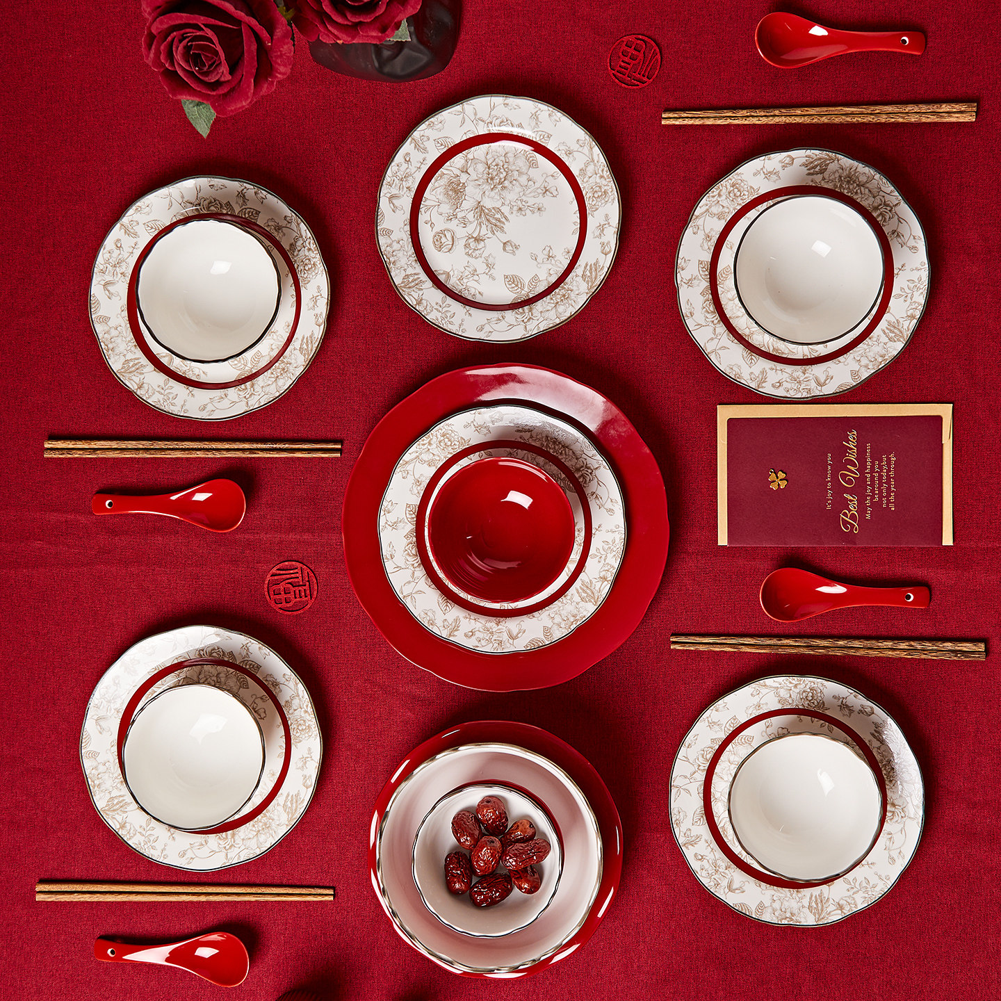 高档碗碟餐具陶瓷新婚礼物送新娘红色碗盘筷套装乔迁新居结婚礼盒